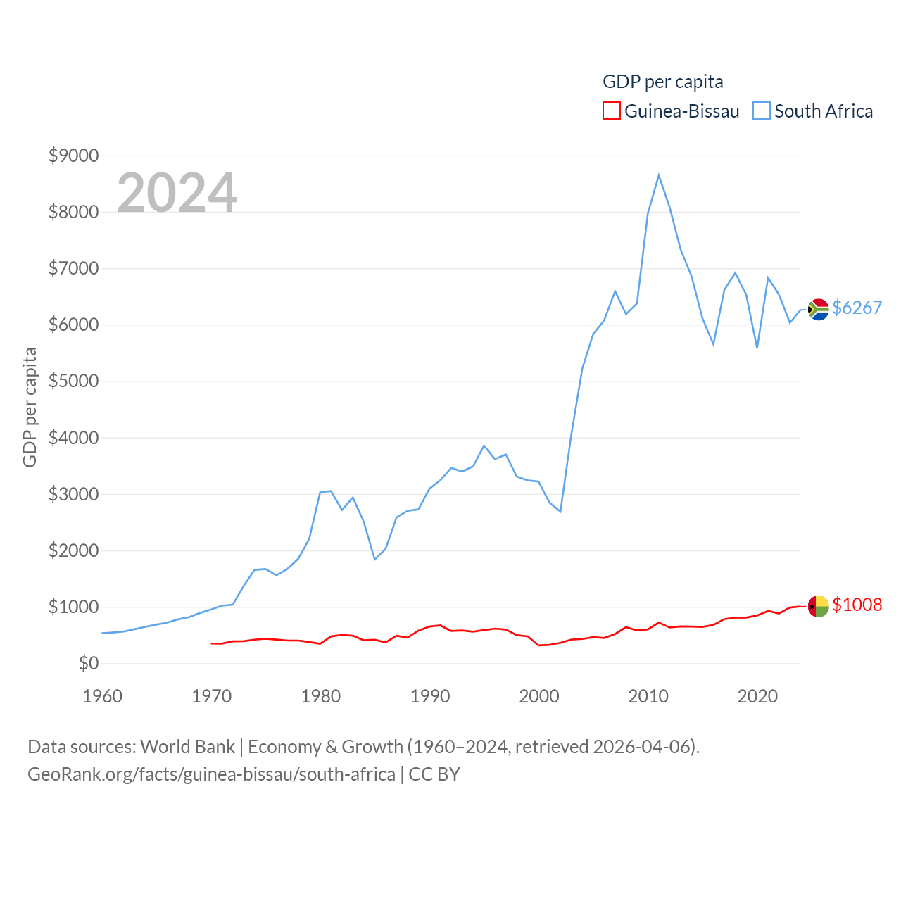 By GDP, Guinea-Bissau ranks 176/197 ($2.22B) and South Africa ranks 40/197 ($401B). By GDP per capita, Guinea-Bissau ranks 177/197 ($1,008), while South Africa ranks 111/197 ($6,267).