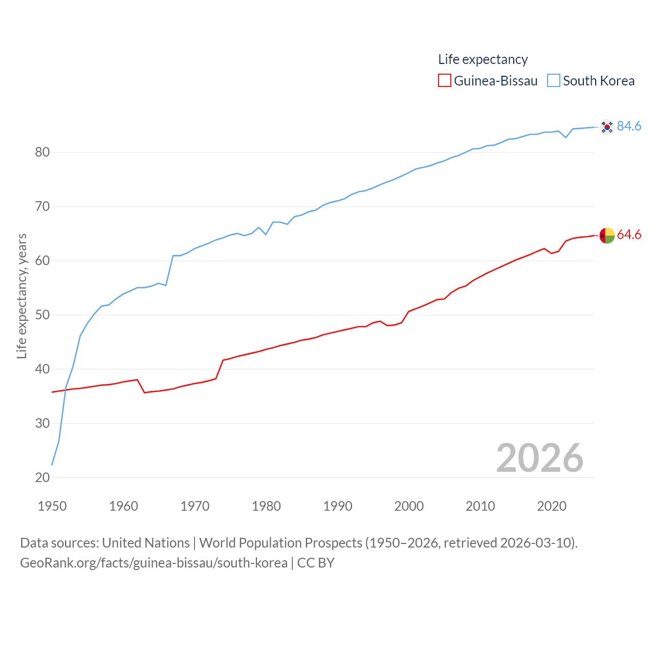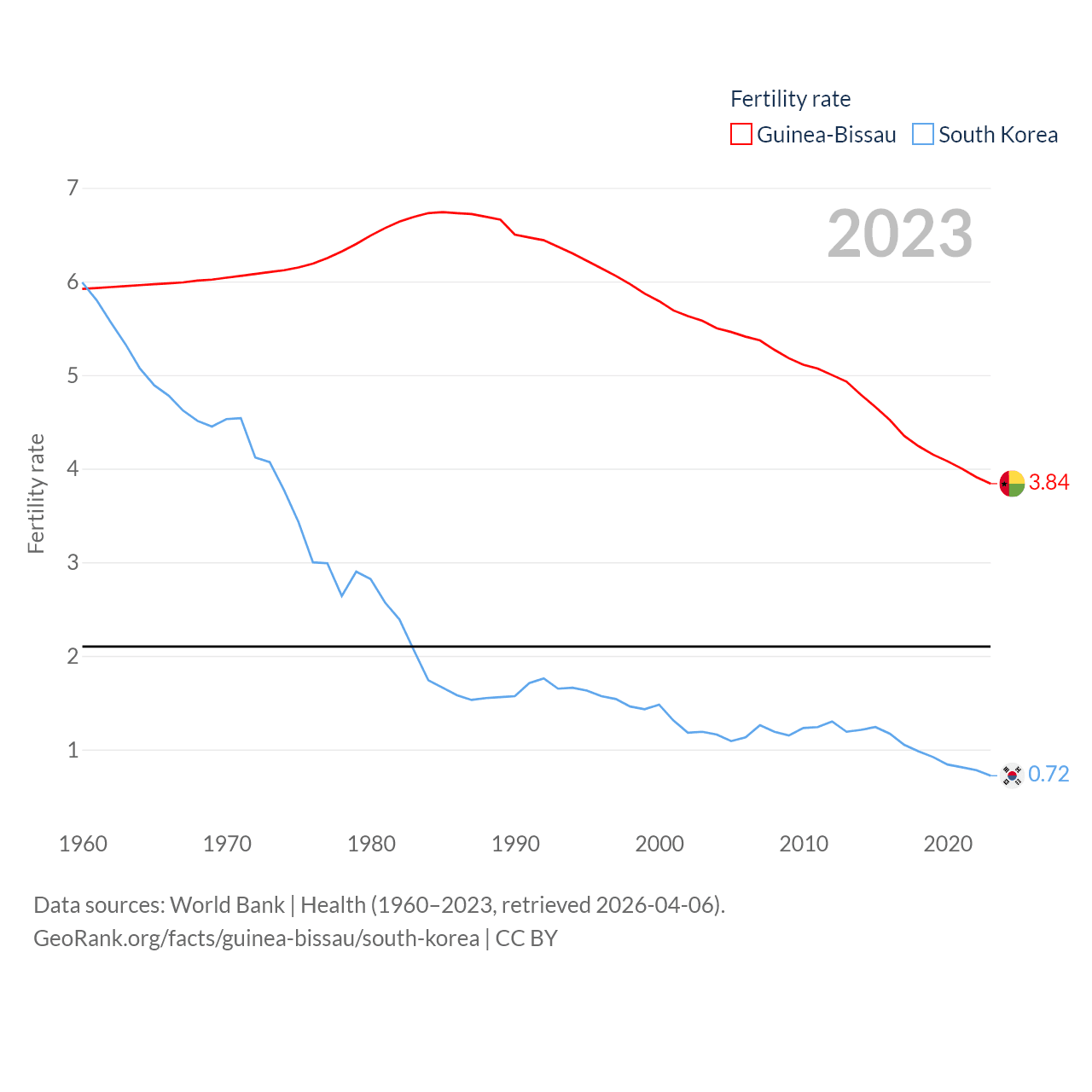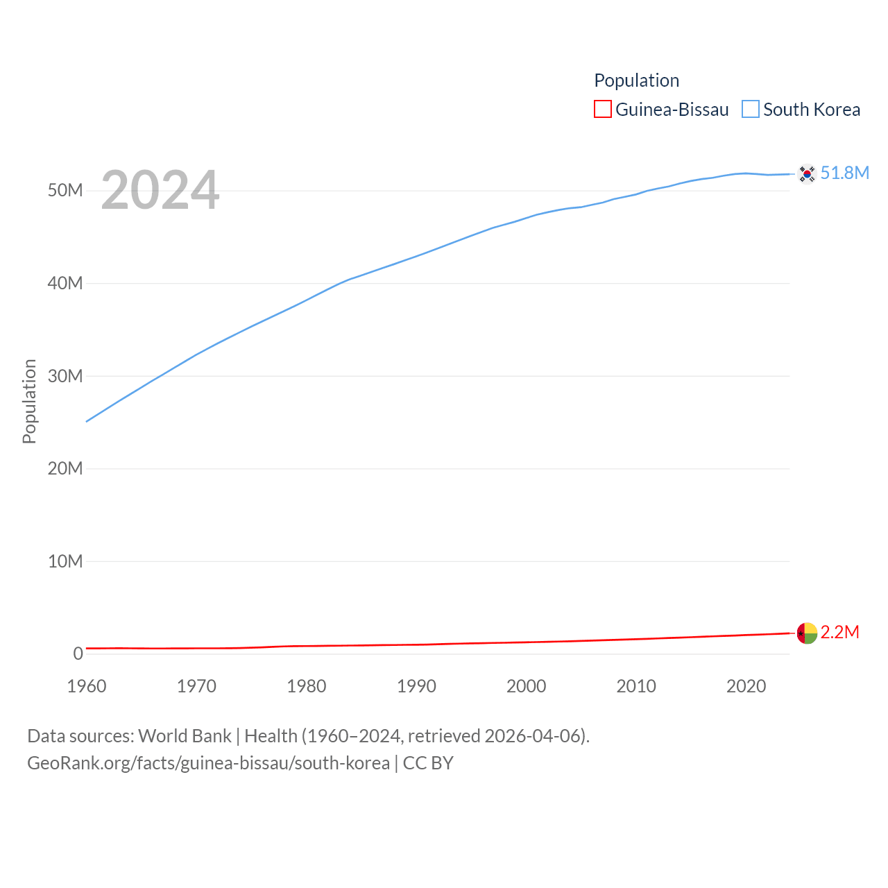 Guinea-Bissau has a population of 2.2M (ranked 146/197), compared with 51.8M in South Korea (ranked 29/197). Guinea-Bissau's land area is 10,857 sq mi versus 37,684 sq mi for South Korea (ranked 139th vs. 105th).