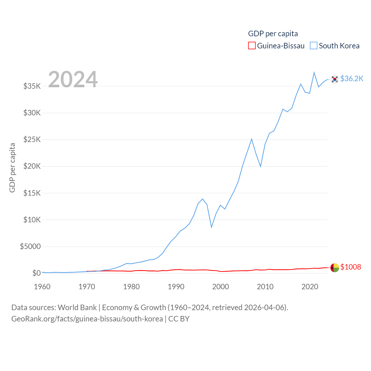By GDP, Guinea-Bissau ranks 176/197 ($2.22B) and South Korea ranks 12/197 ($1.88T). By GDP per capita, Guinea-Bissau ranks 177/197 ($1,008), while South Korea ranks 31/197 ($36,239).
