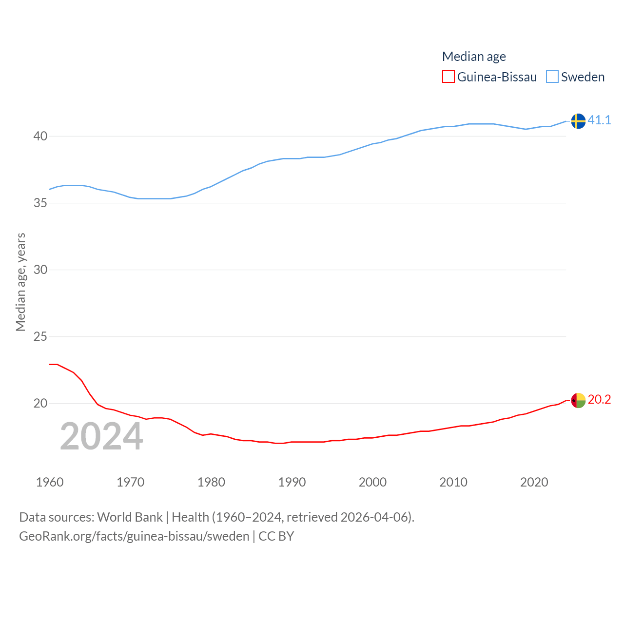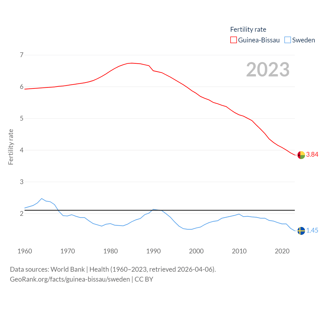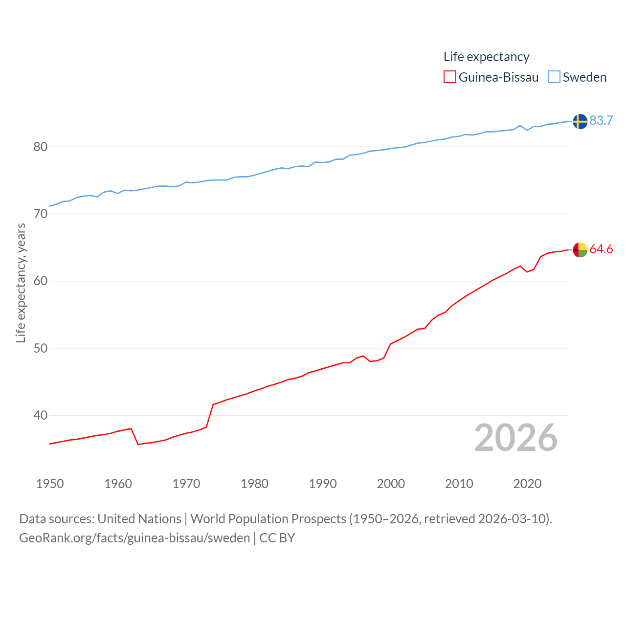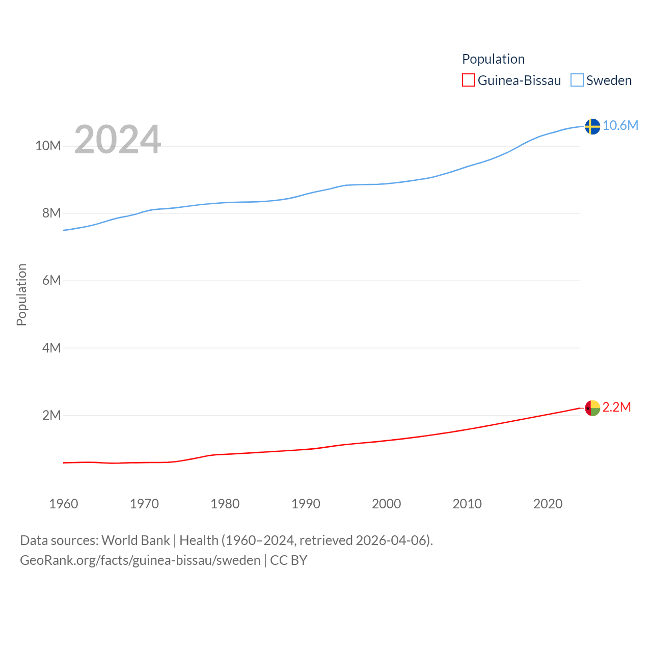 Guinea-Bissau has a population of 2.2M (ranked 146/197), compared with 10.6M in Sweden (ranked 93/197). Guinea-Bissau's land area is 10,857 sq mi versus 157,248 sq mi for Sweden (ranked 139th vs. 58th).