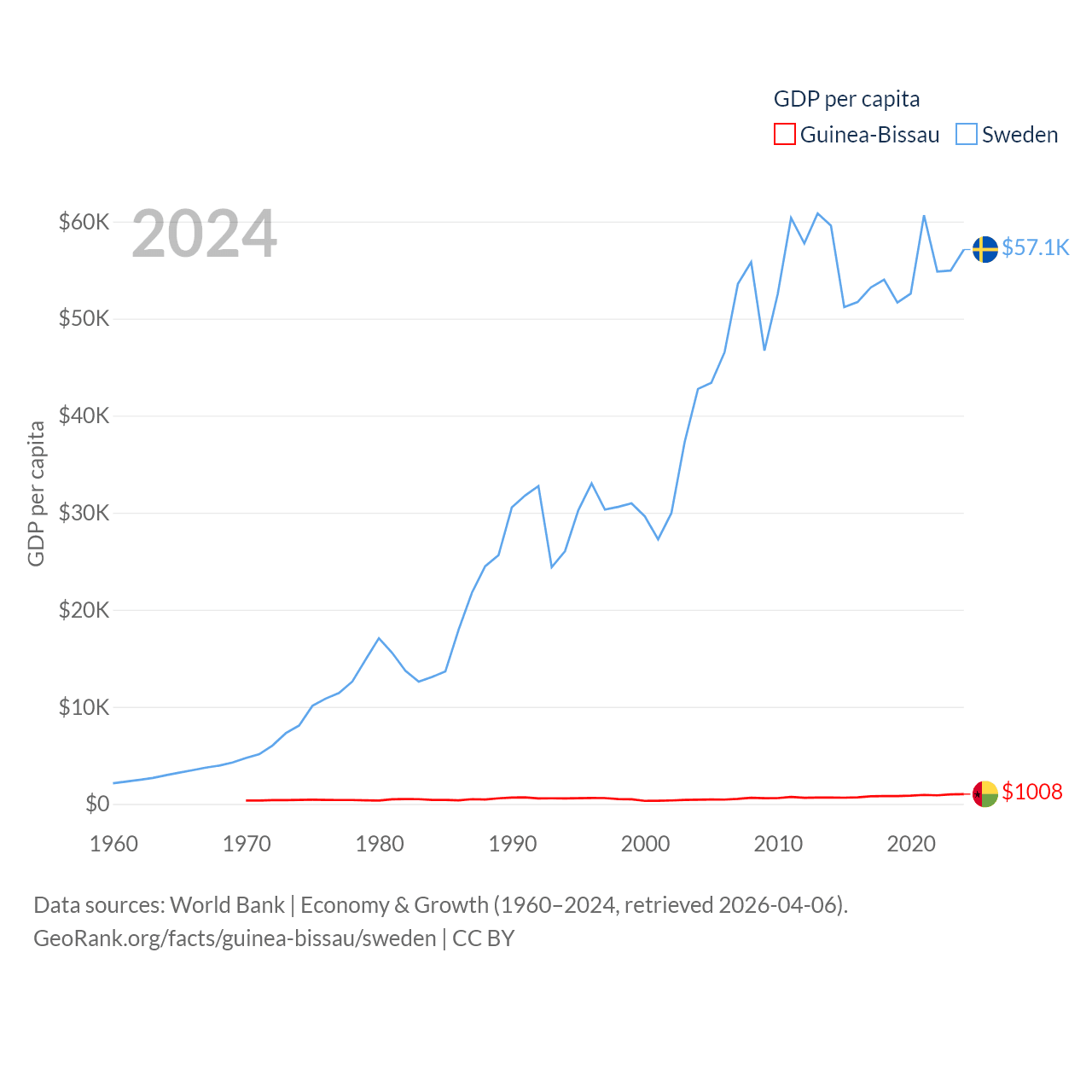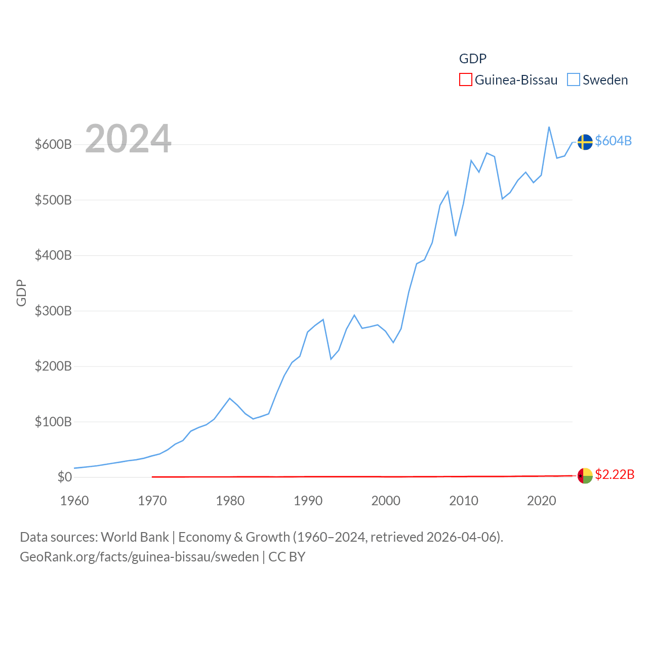 By GDP, Guinea-Bissau ranks 176/197 ($2.22B) and Sweden ranks 26/197 ($604B). By GDP per capita, Guinea-Bissau ranks 177/197 ($1,008), while Sweden ranks 17/197 ($57,117).
