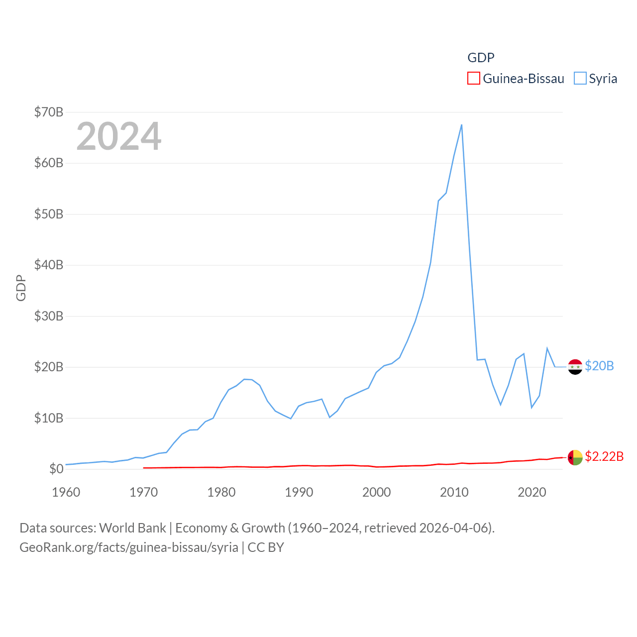 By GDP, Guinea-Bissau ranks 176/197 ($2.22B) and Syria ranks 129/197 ($20B). By GDP per capita, Guinea-Bissau ranks 177/197 ($1,008), while Syria ranks 185/197 ($847).