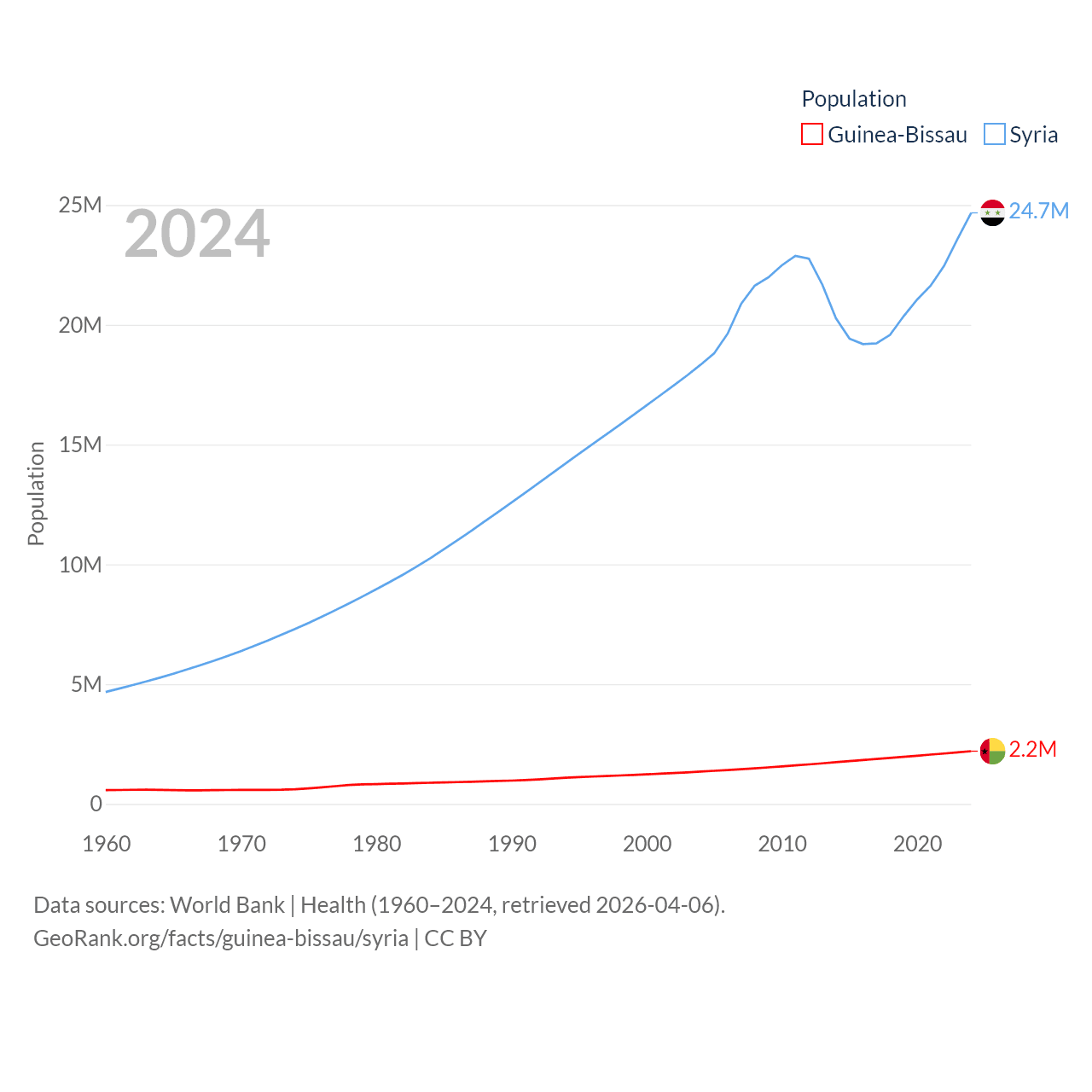 Guinea-Bissau has a population of 2.2M (ranked 146/197), compared with 24.7M in Syria (ranked 57/197). Guinea-Bissau's land area is 10,857 sq mi versus 70,900 sq mi for Syria (ranked 139th vs. 87th).