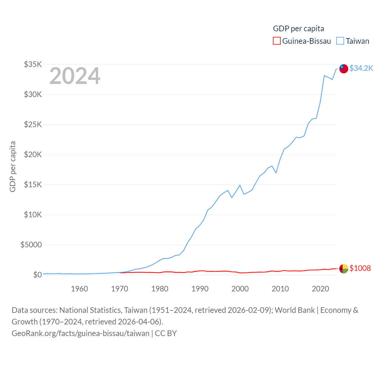 By GDP, Guinea-Bissau ranks 176/197 ($2.22B) and Taiwan ranks 22/197 ($802B). By GDP per capita, Guinea-Bissau ranks 177/197 ($1,008), while Taiwan ranks 35/197 ($34,238).