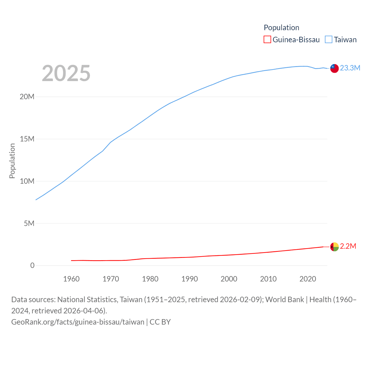 Guinea-Bissau has a population of 2.2M (ranked 146/197), compared with 23.3M in Taiwan (ranked 60/197). Guinea-Bissau's land area is 10,857 sq mi versus 13,976 sq mi for Taiwan (ranked 139th vs. 133rd).