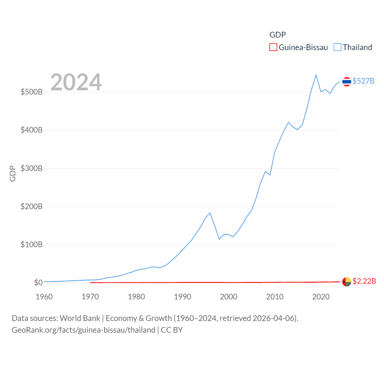 By GDP, Guinea-Bissau ranks 176/197 ($2.22B) and Thailand ranks 31/197 ($527B). By GDP per capita, Guinea-Bissau ranks 177/197 ($1,008), while Thailand ranks 100/197 ($7,347).