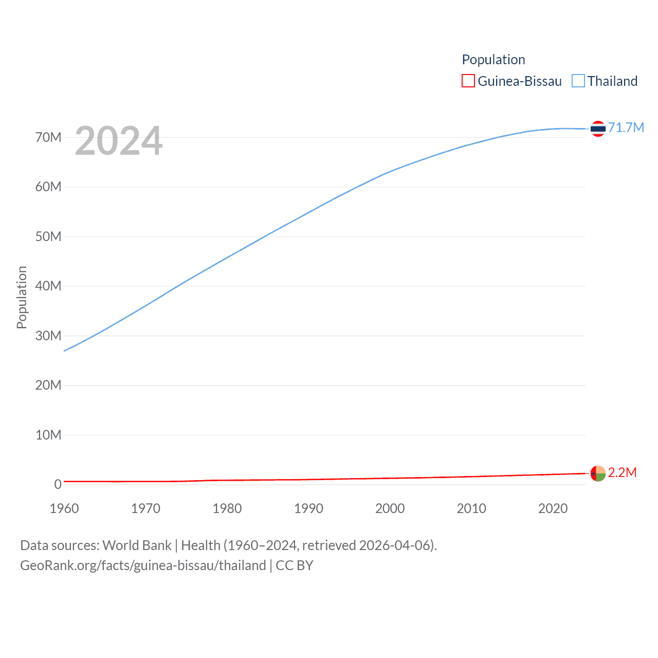 Guinea-Bissau has a population of 2.2M (ranked 146/197), compared with 71.7M in Thailand (ranked 20/197). Guinea-Bissau's land area is 10,857 sq mi versus 197,256 sq mi for Thailand (ranked 139th vs. 50th).