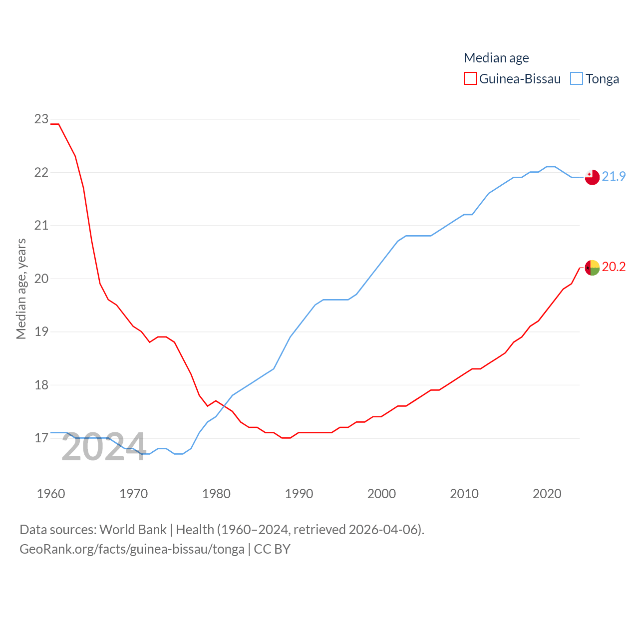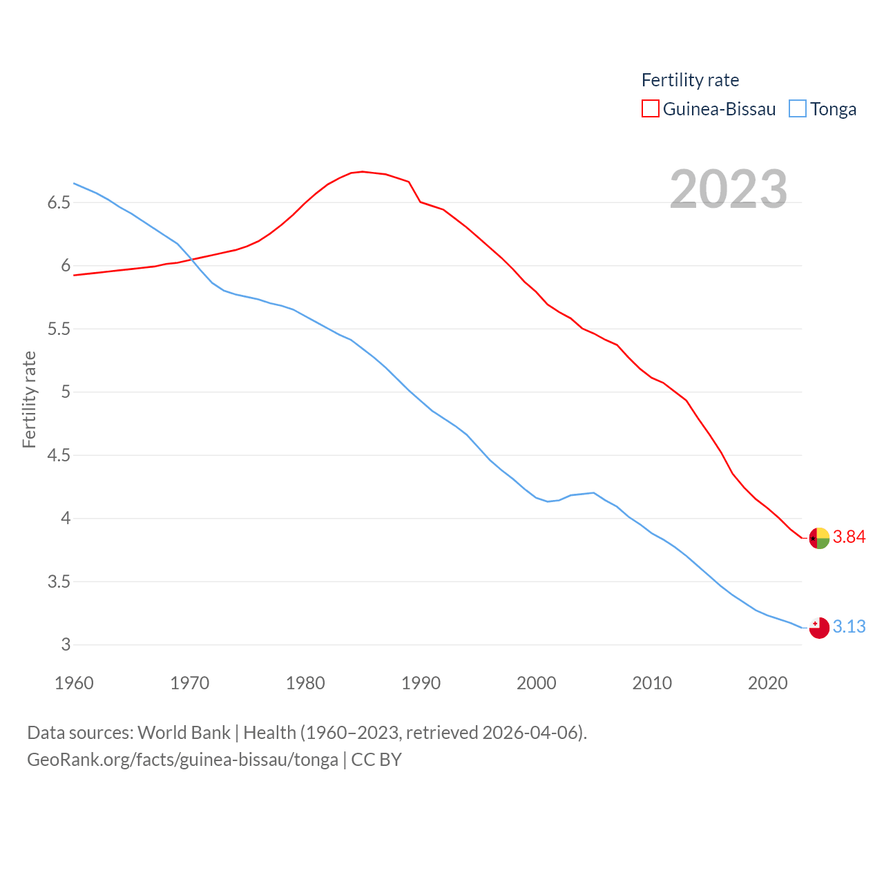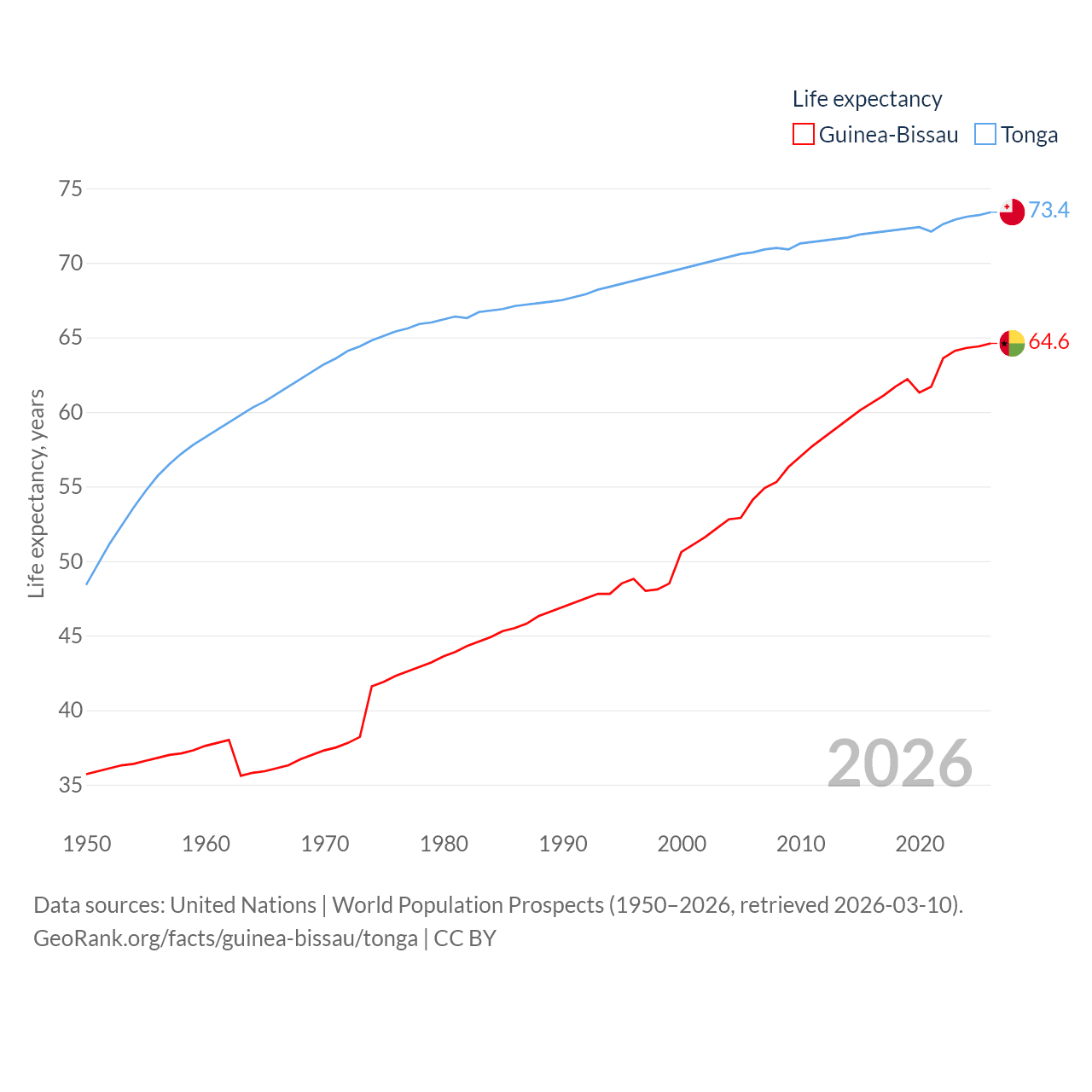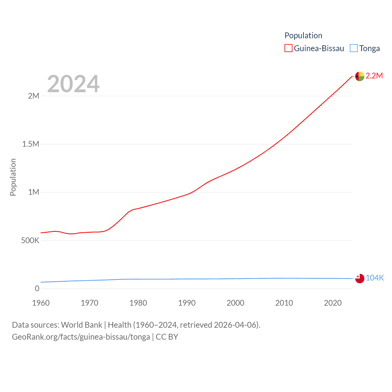 Guinea-Bissau has a population of 2.2M (ranked 146/197), compared with 104K in Tonga (ranked 183/197). Guinea-Bissau's land area is 10,857 sq mi versus 278 sq mi for Tonga (ranked 139th vs. 176th).