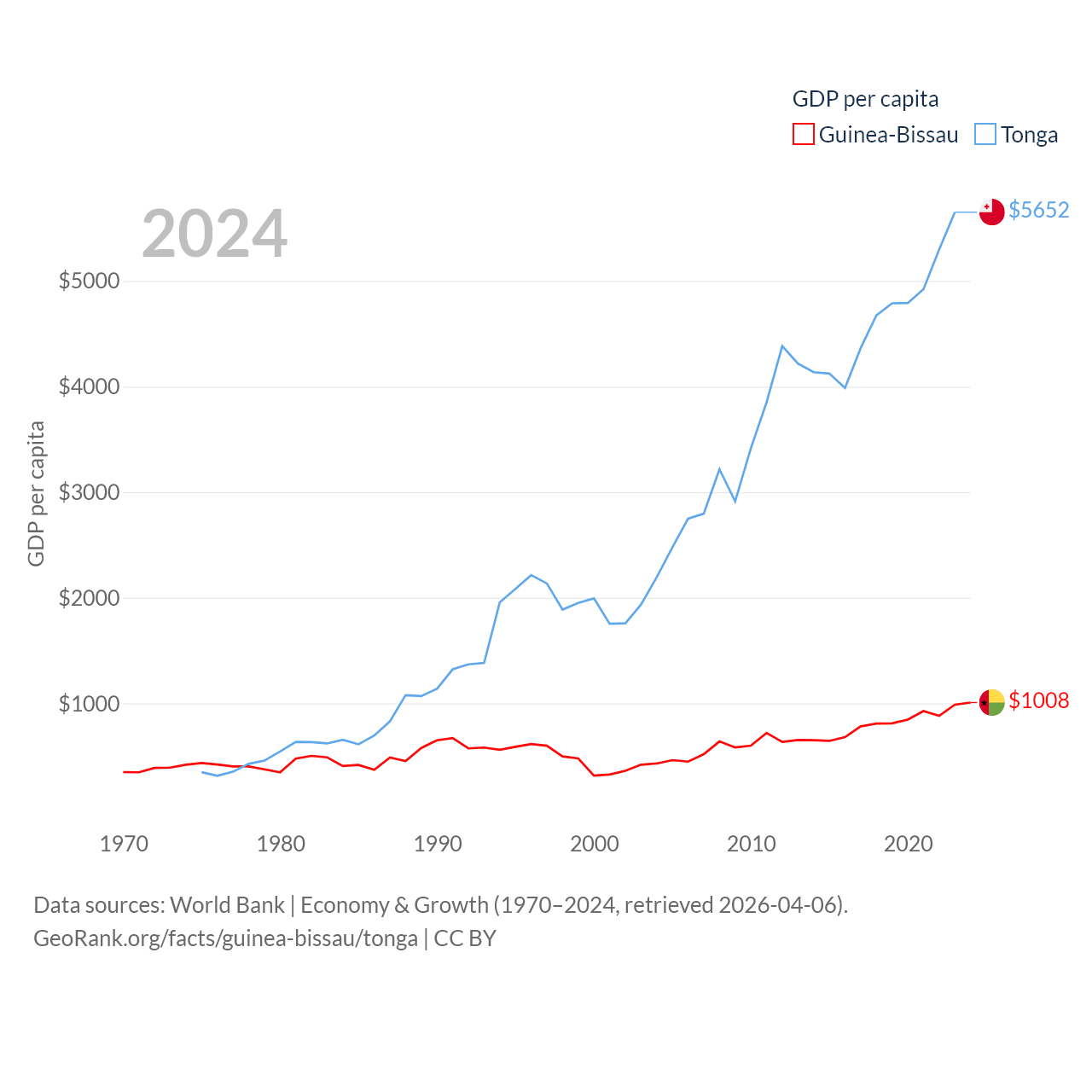 By GDP, Guinea-Bissau ranks 176/197 ($2.22B) and Tonga ranks 191/197 ($591M). By GDP per capita, Guinea-Bissau ranks 177/197 ($1,008), while Tonga ranks 115/197 ($5,652).
