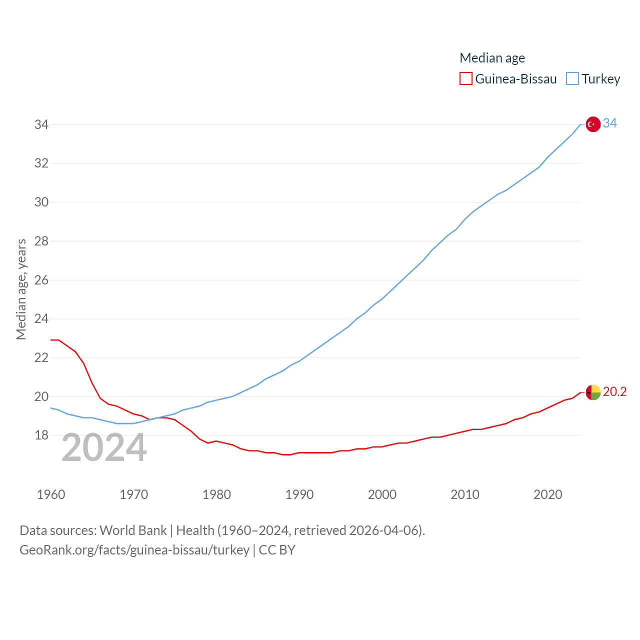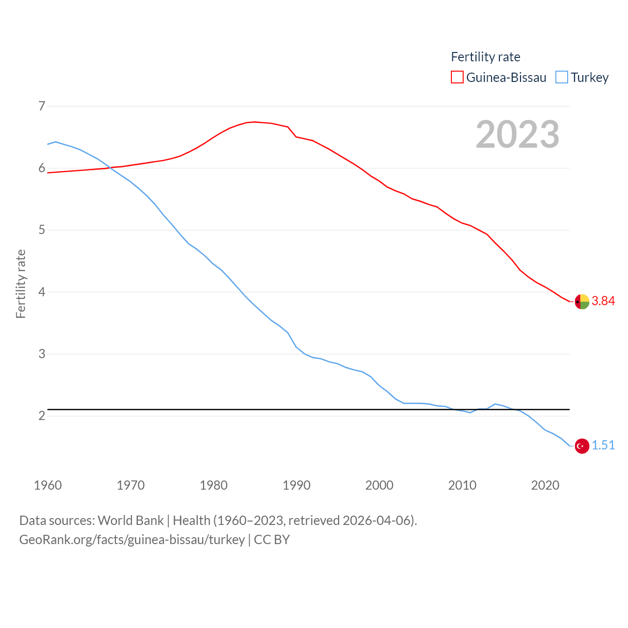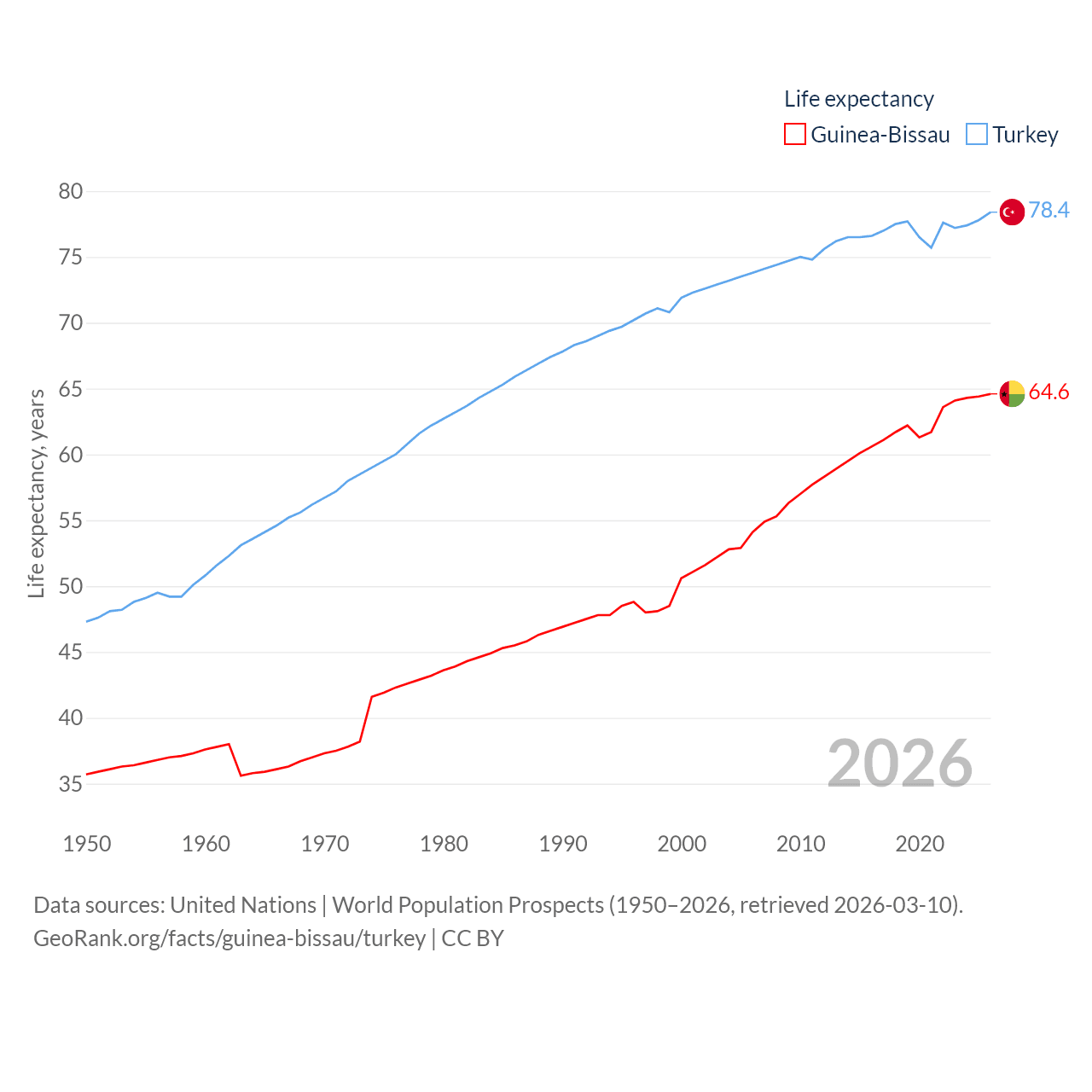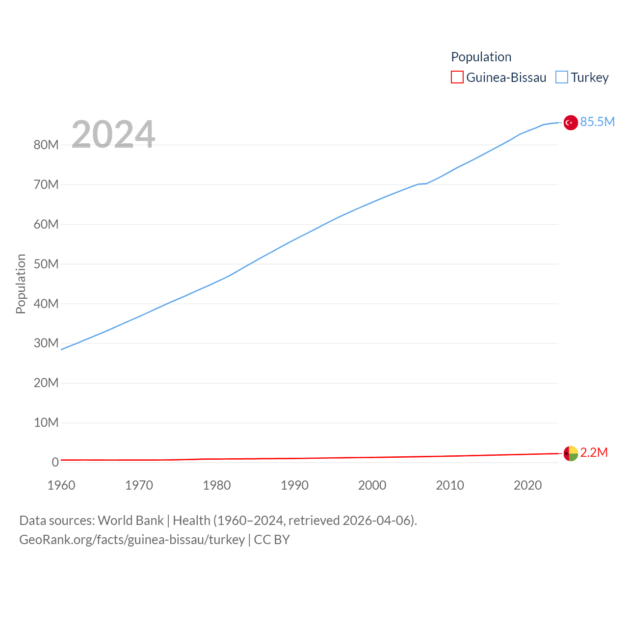 Guinea-Bissau has a population of 2.2M (ranked 146/197), compared with 85.5M in Turkey (ranked 18/197). Guinea-Bissau's land area is 10,857 sq mi versus 297,156 sq mi for Turkey (ranked 139th vs. 36th).