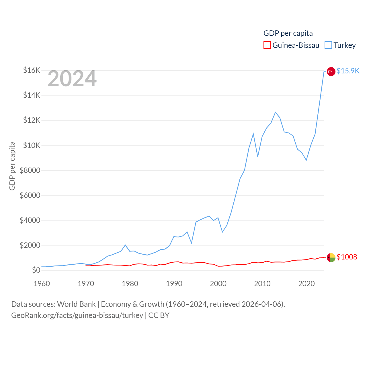 By GDP, Guinea-Bissau ranks 176/197 ($2.22B) and Turkey ranks 17/197 ($1.36T). By GDP per capita, Guinea-Bissau ranks 177/197 ($1,008), while Turkey ranks 66/197 ($15,893).