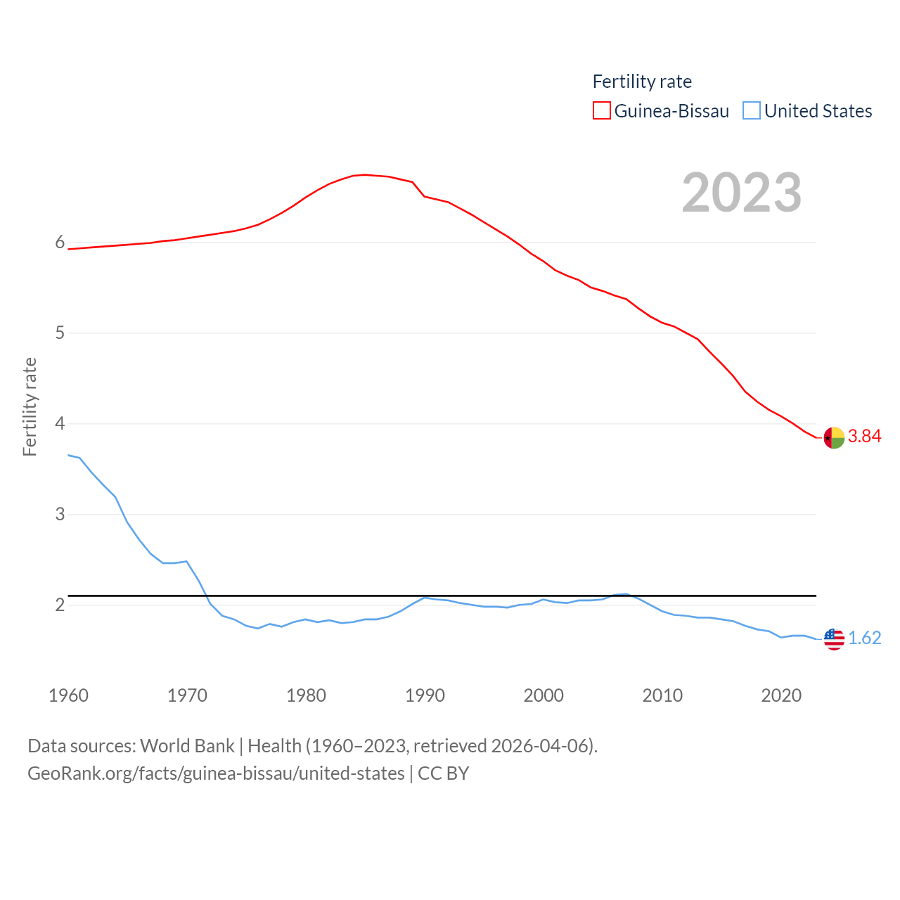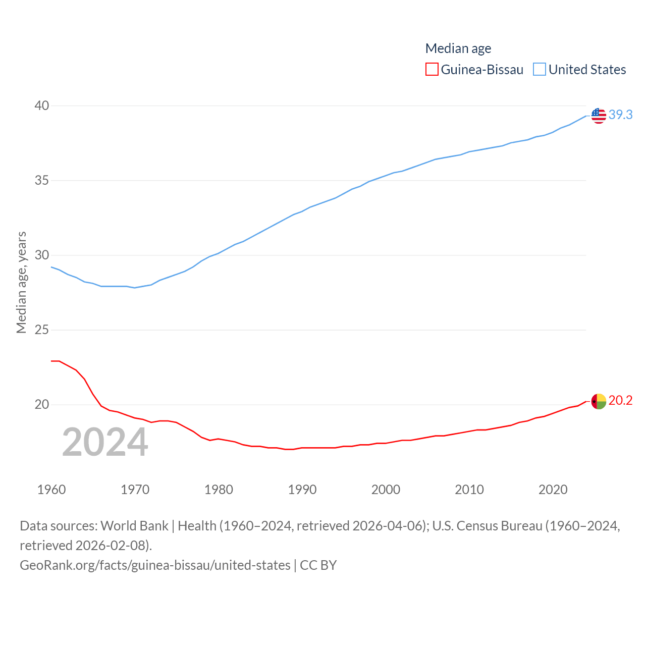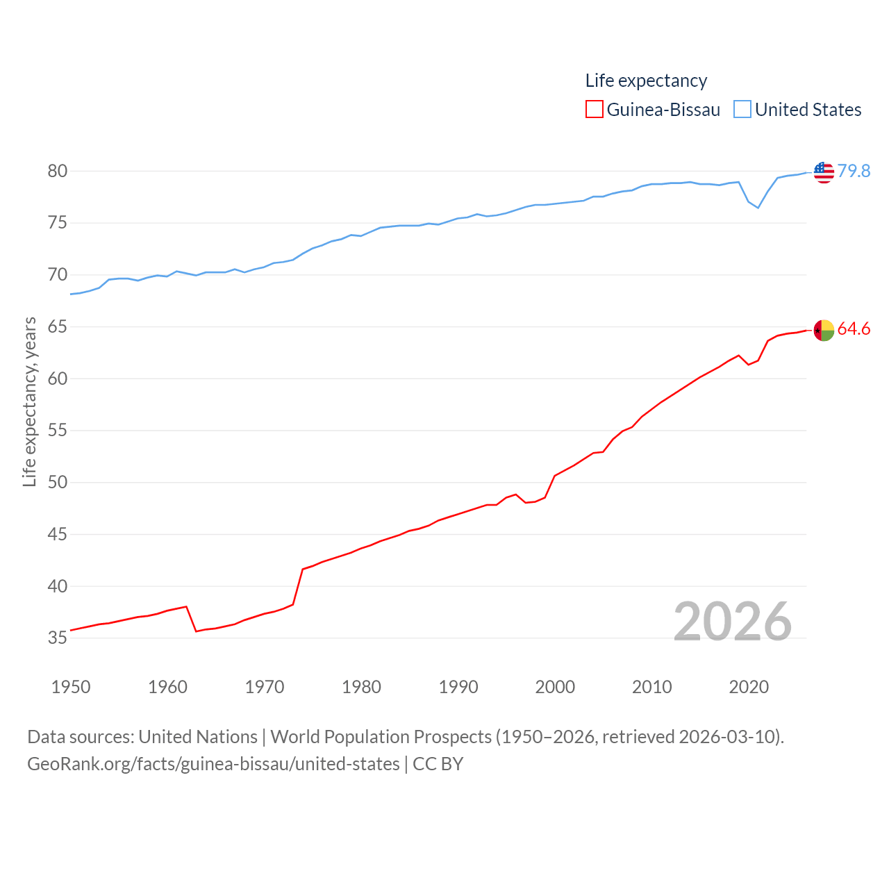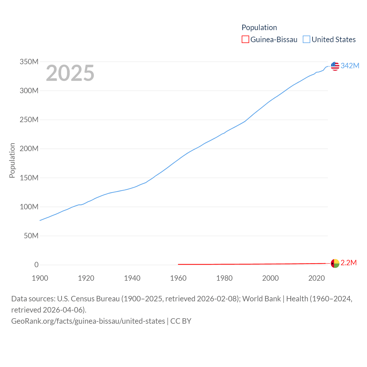 Guinea-Bissau has a population of 2.2M (ranked 146/197), compared with 342M in The United States (ranked 3/197). Guinea-Bissau's land area is 10,857 sq mi versus 3,531,839 sq mi for The United States (ranked 139th vs. 3rd).