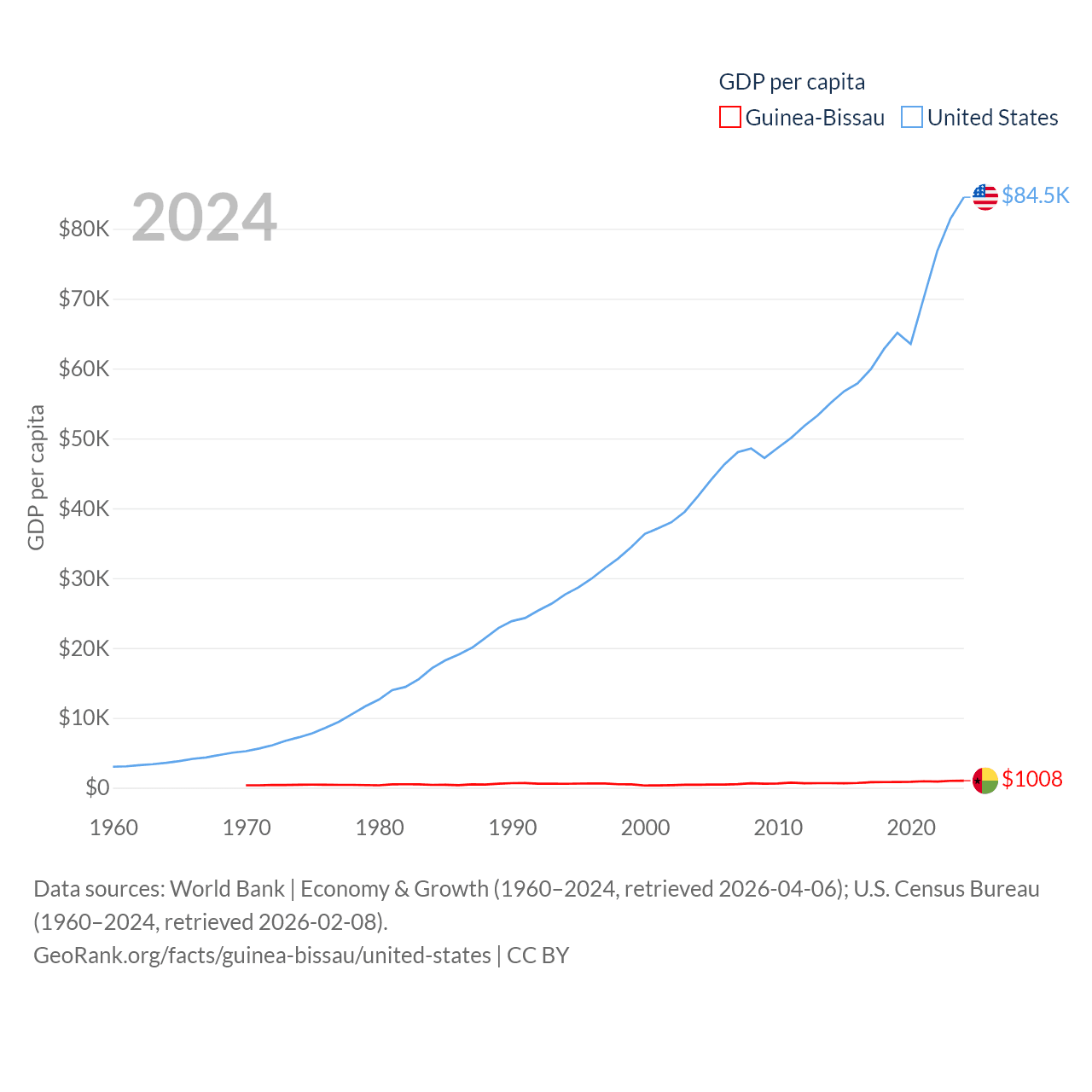 By GDP, Guinea-Bissau ranks 176/197 ($2.22B) and The United States ranks 1/197 ($28.8T). By GDP per capita, Guinea-Bissau ranks 177/197 ($1,008), while The United States ranks 10/197 ($84,534).