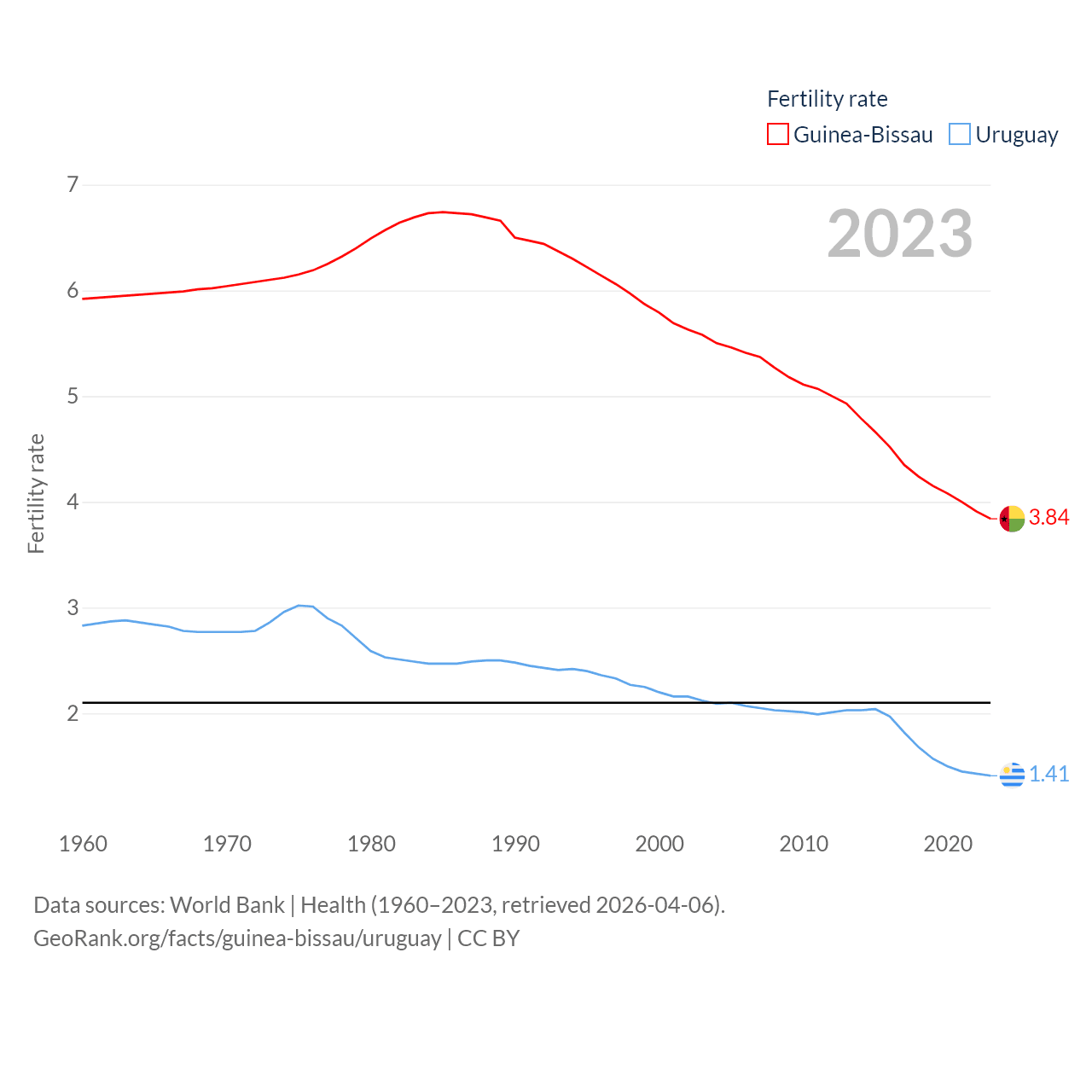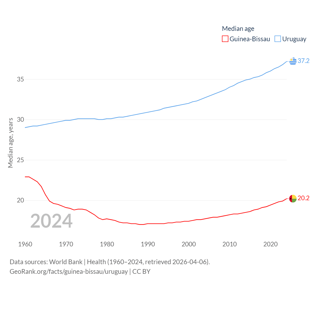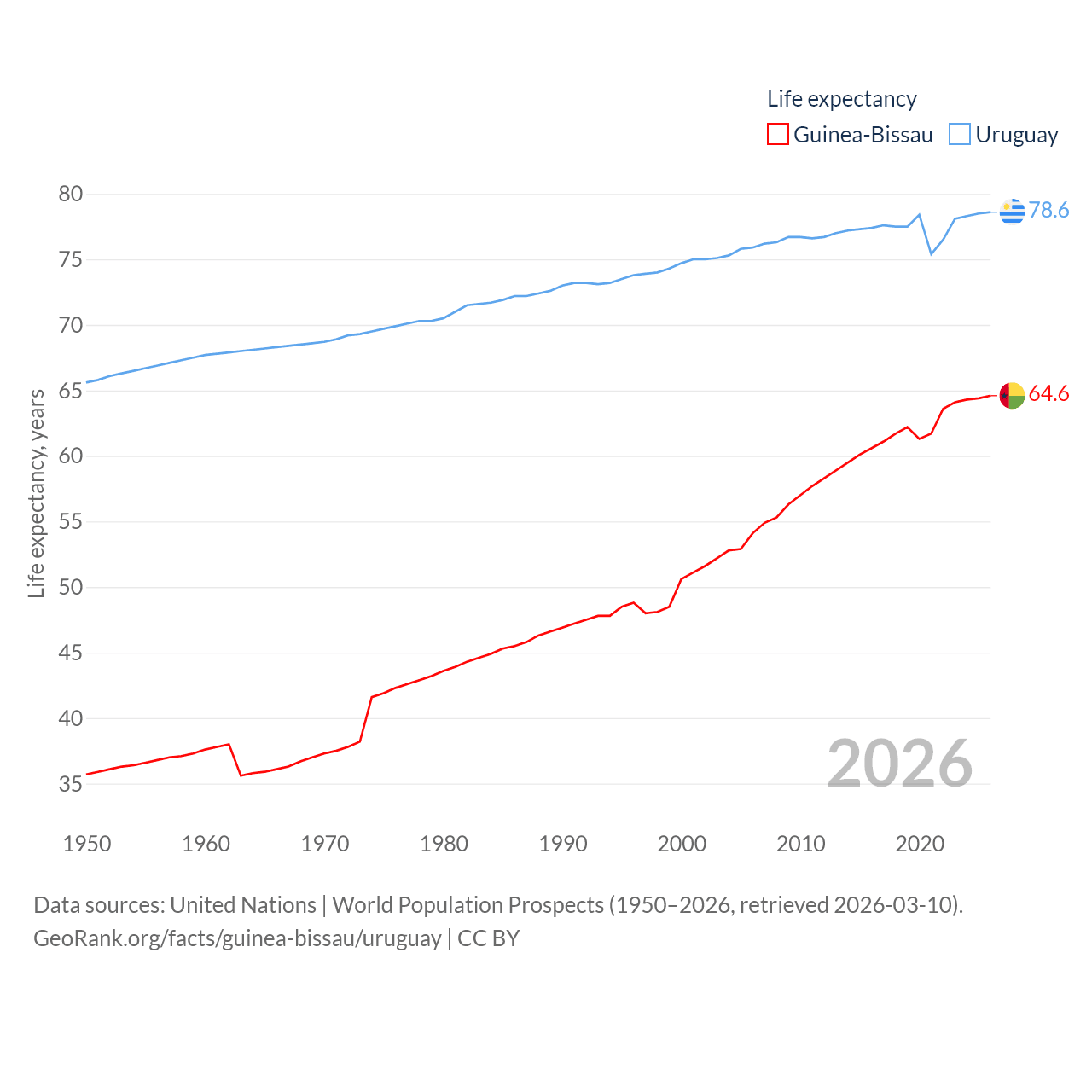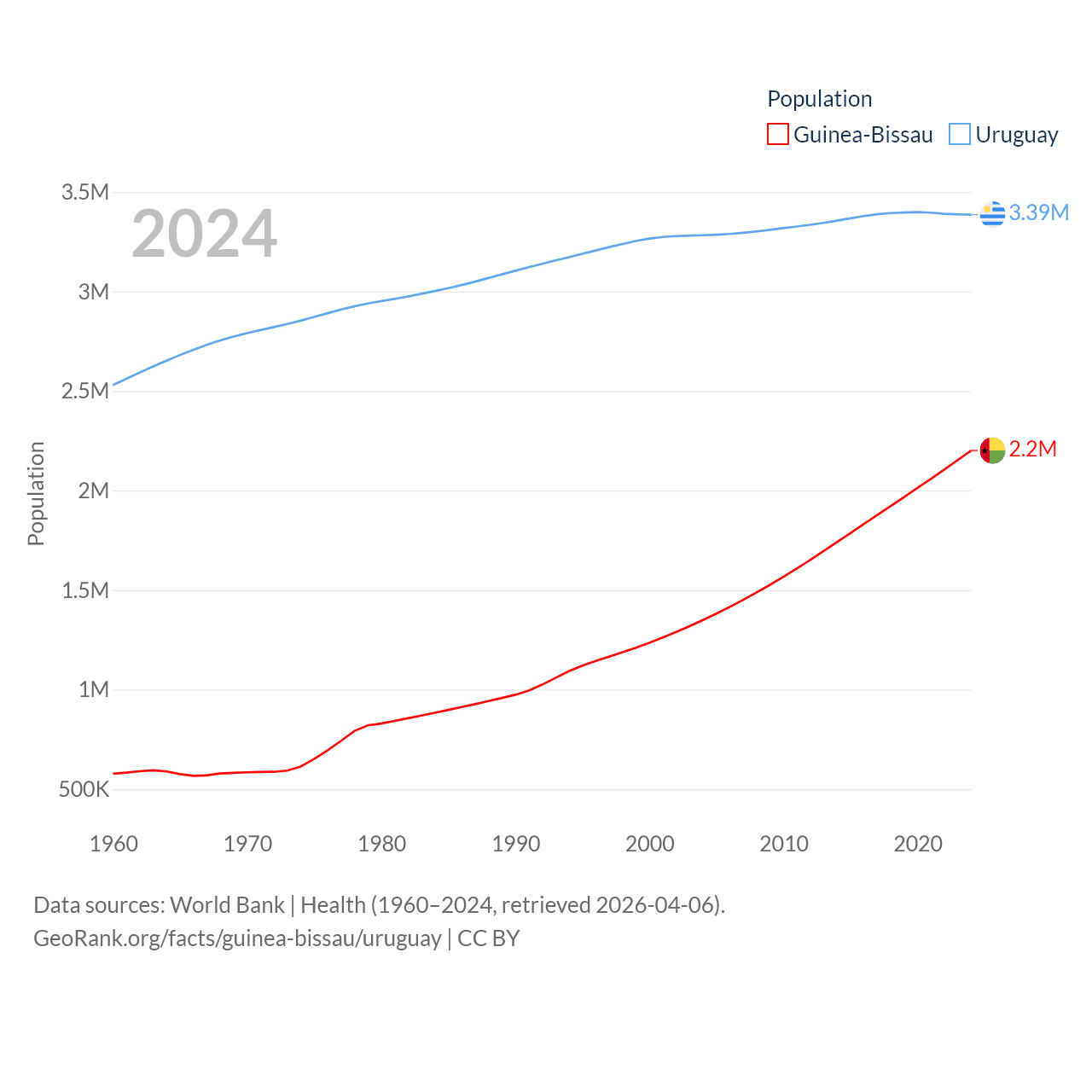 Guinea-Bissau has a population of 2.2M (ranked 146/197), compared with 3.39M in Uruguay (ranked 133/197). Guinea-Bissau's land area is 10,857 sq mi versus 67,576 sq mi for Uruguay (ranked 139th vs. 89th).