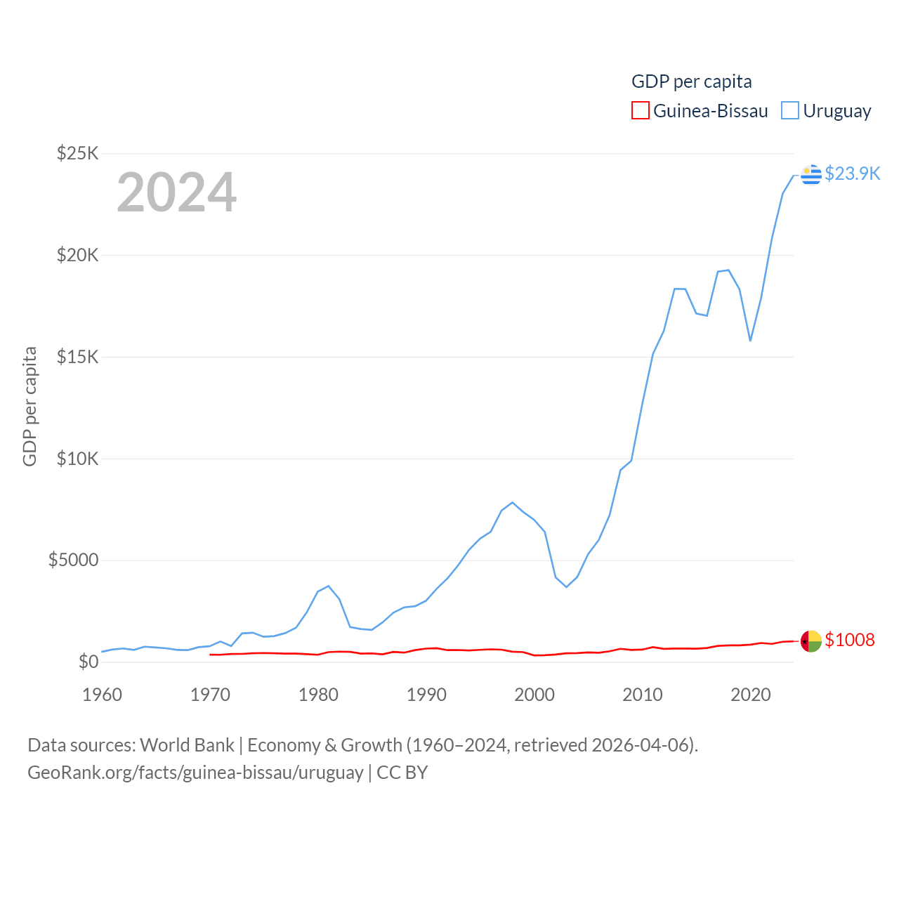 By GDP, Guinea-Bissau ranks 176/197 ($2.22B) and Uruguay ranks 81/197 ($81B). By GDP per capita, Guinea-Bissau ranks 177/197 ($1,008), while Uruguay ranks 52/197 ($23,907).