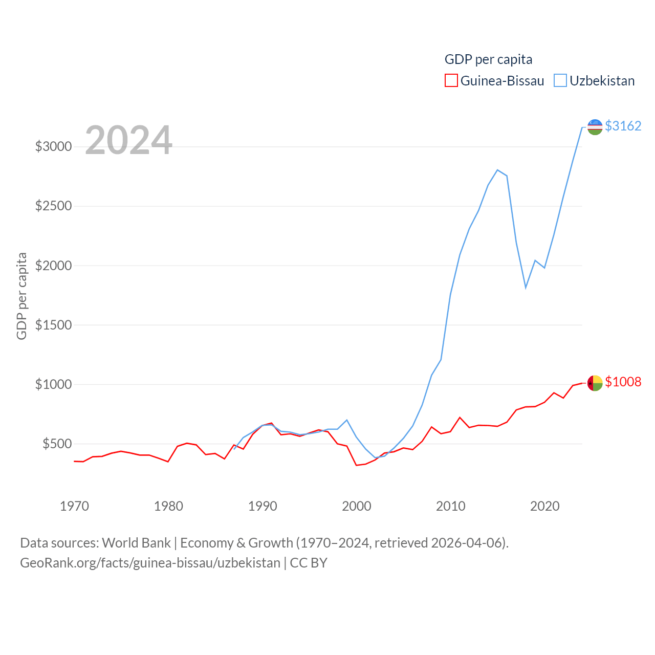 By GDP, Guinea-Bissau ranks 176/197 ($2.22B) and Uzbekistan ranks 66/197 ($115B). By GDP per capita, Guinea-Bissau ranks 177/197 ($1,008), while Uzbekistan ranks 139/197 ($3,162).