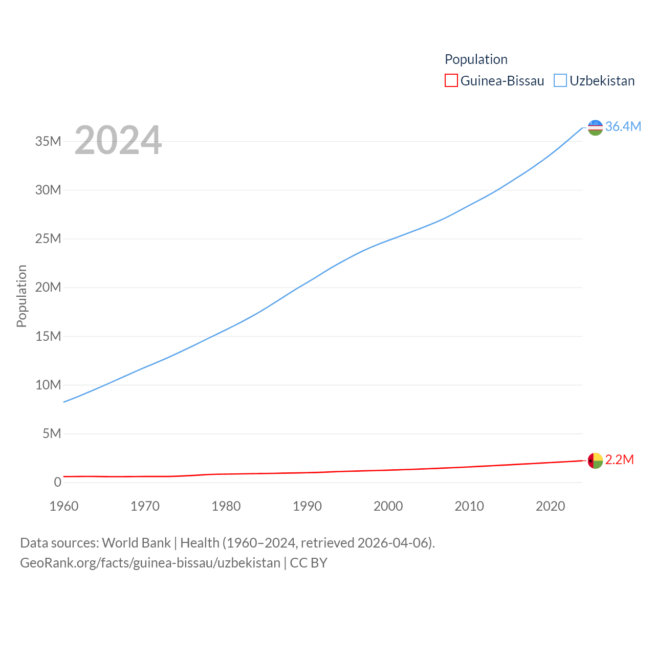 Guinea-Bissau has a population of 2.2M (ranked 146/197), compared with 36.4M in Uzbekistan (ranked 43/197). Guinea-Bissau's land area is 10,857 sq mi versus 170,136 sq mi for Uzbekistan (ranked 139th vs. 56th).