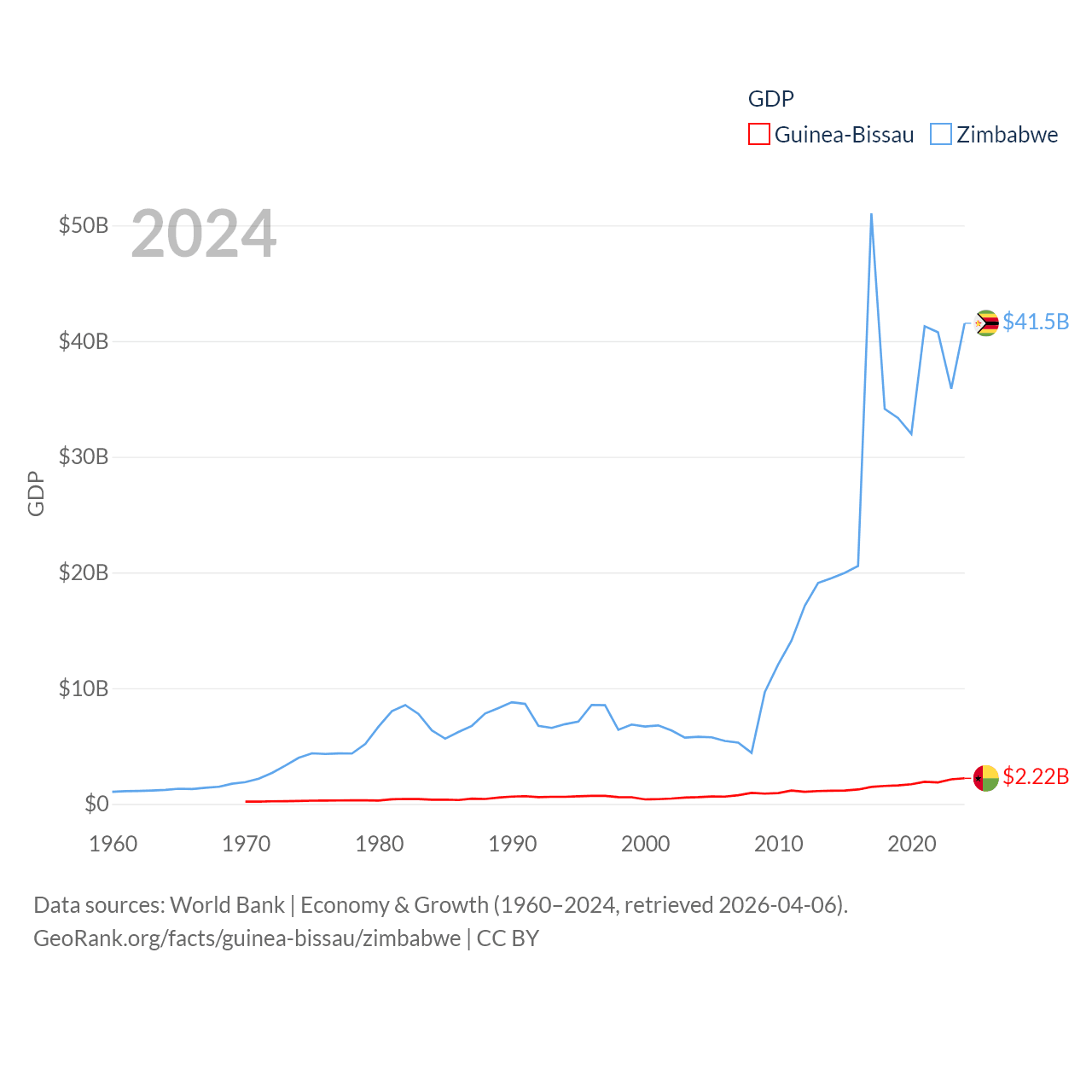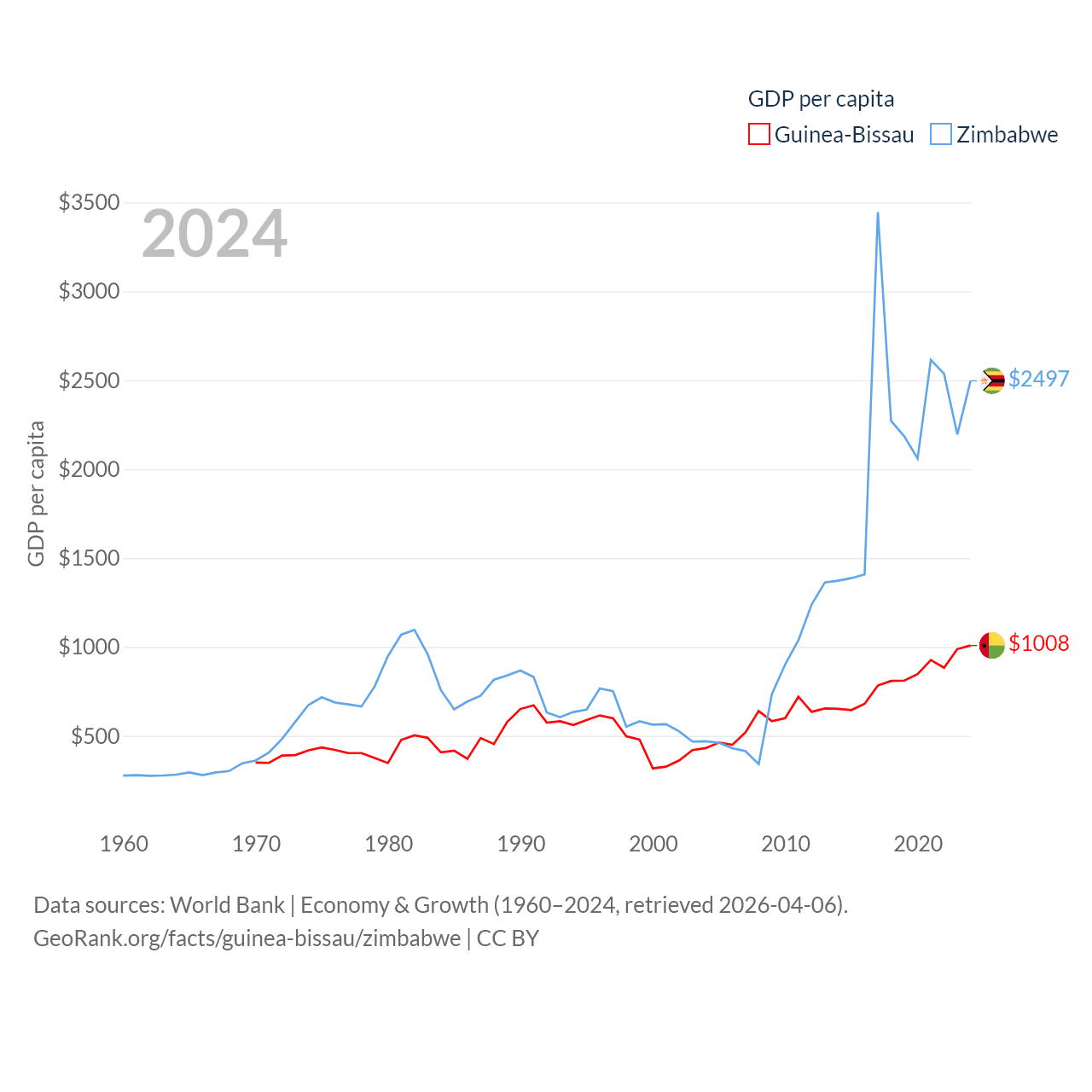 By GDP, Guinea-Bissau ranks 176/197 ($2.22B) and Zimbabwe ranks 102/197 ($41.5B). By GDP per capita, Guinea-Bissau ranks 177/197 ($1,008), while Zimbabwe ranks 148/197 ($2,497).