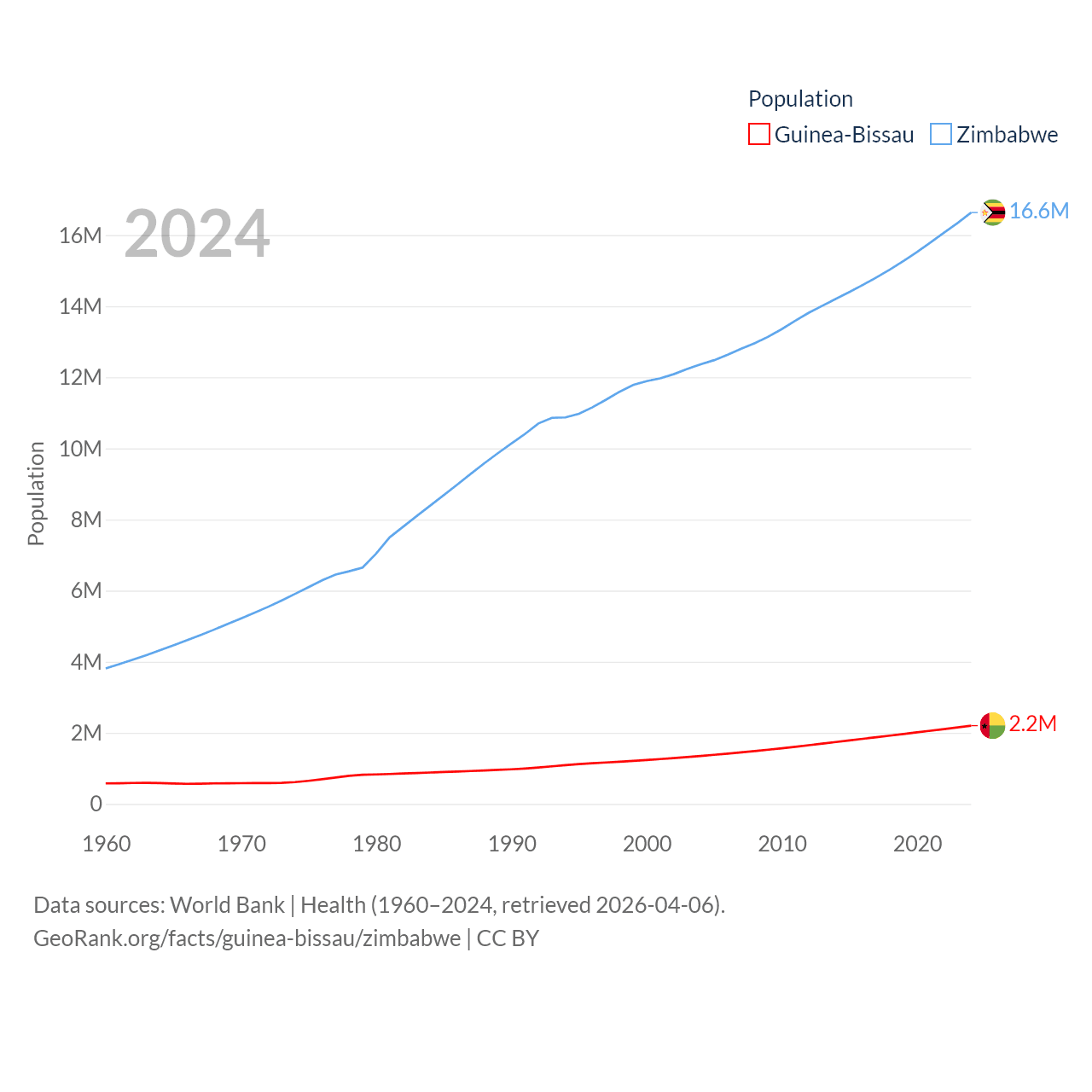 Guinea-Bissau has a population of 2.2M (ranked 146/197), compared with 16.6M in Zimbabwe (ranked 74/197). Guinea-Bissau's land area is 10,857 sq mi versus 149,364 sq mi for Zimbabwe (ranked 139th vs. 60th).