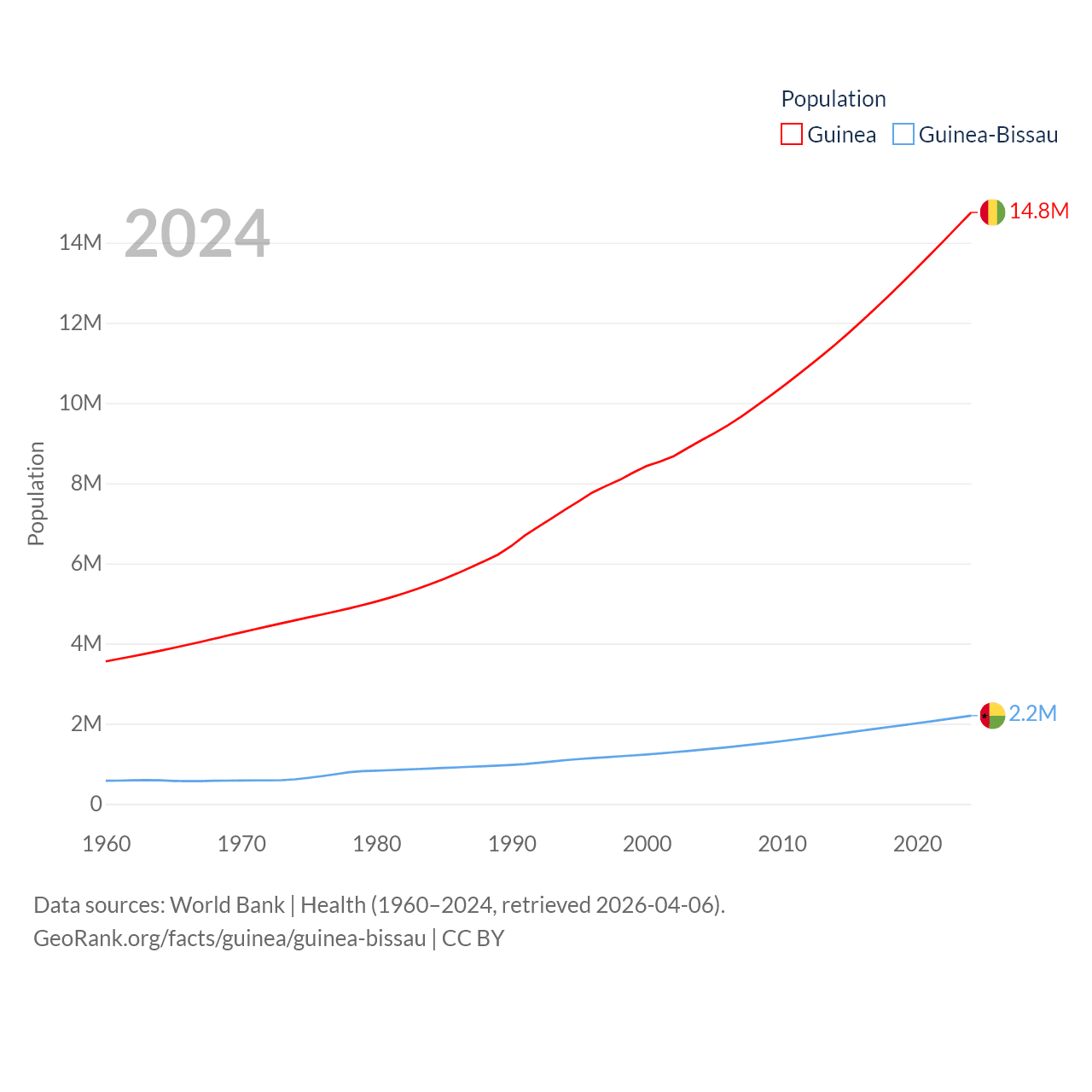 Guinea has a population of 14.8M (ranked 75/197), compared with 2.2M in Guinea-Bissau (ranked 146/197). Guinea's land area is 94,873 sq mi versus 10,857 sq mi for Guinea-Bissau (ranked 77th vs. 139th).