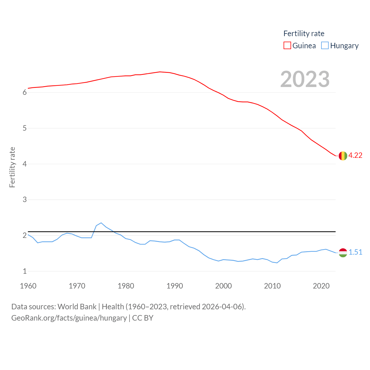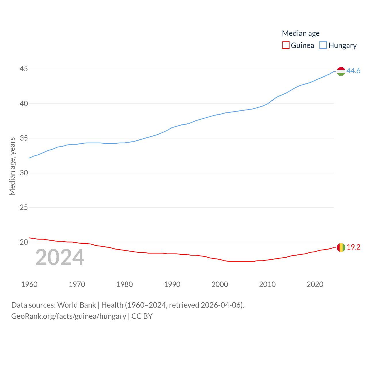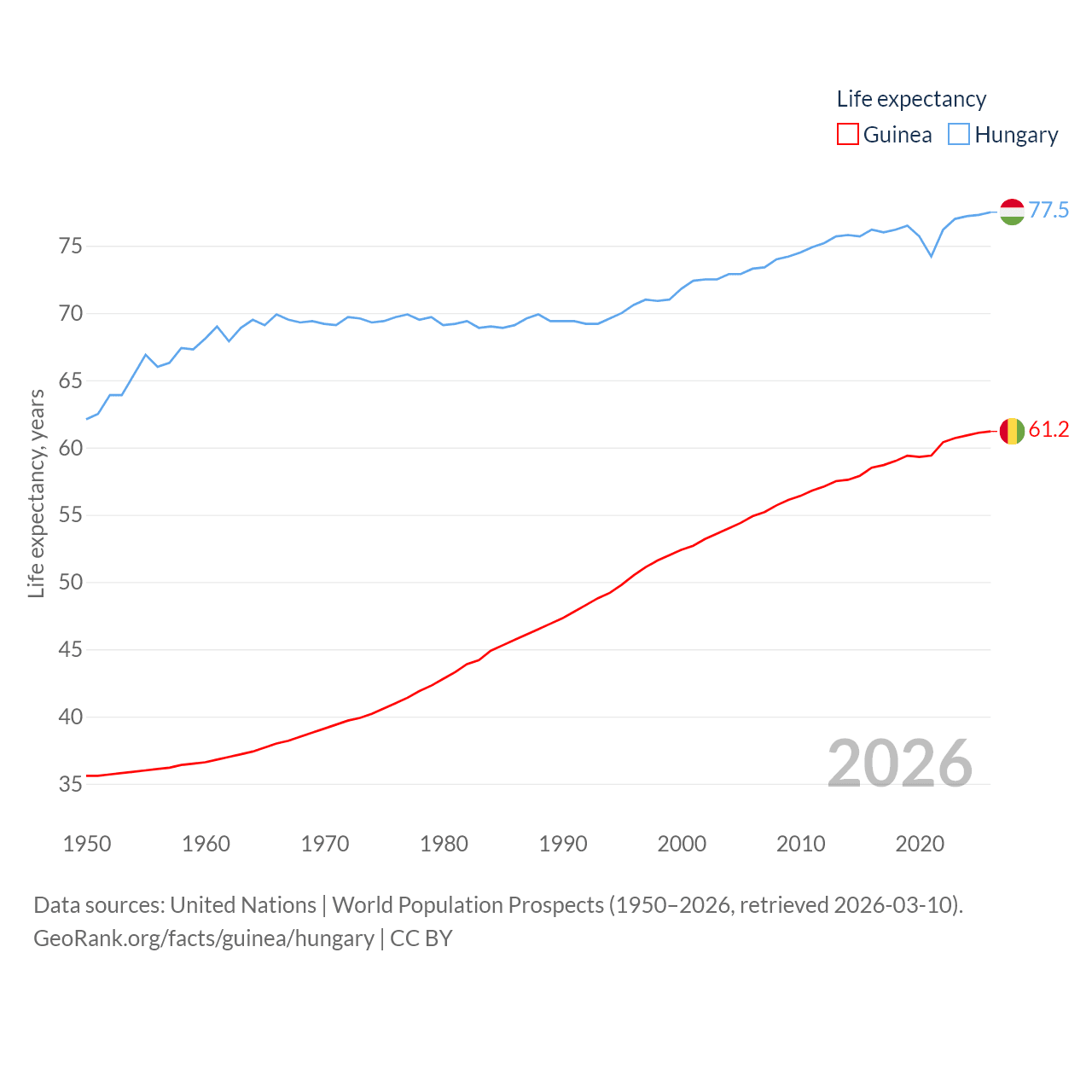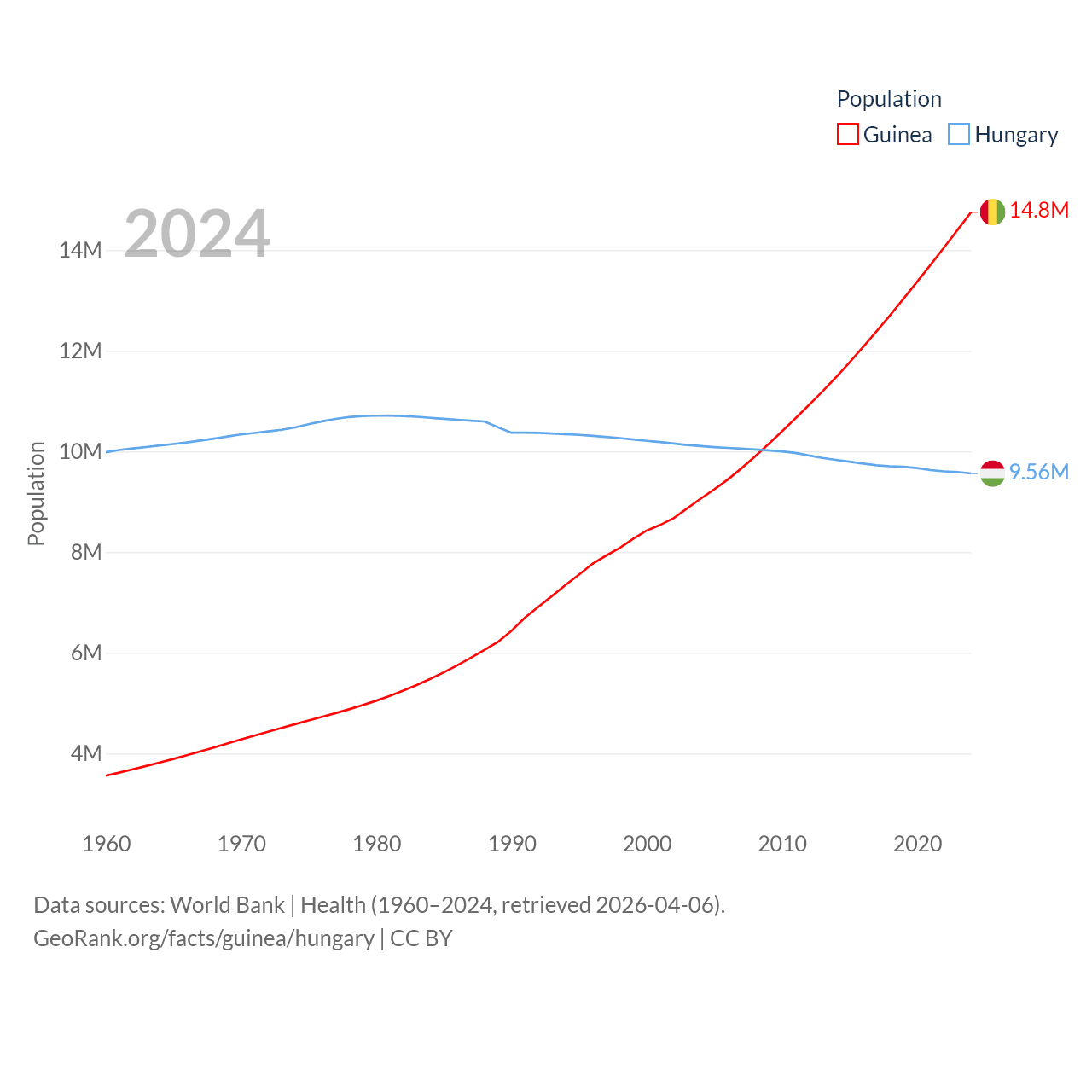 Guinea has a population of 14.8M (ranked 75/197), compared with 9.56M in Hungary (ranked 97/197). Guinea's land area is 94,873 sq mi versus 35,236 sq mi for Hungary (ranked 77th vs. 109th).