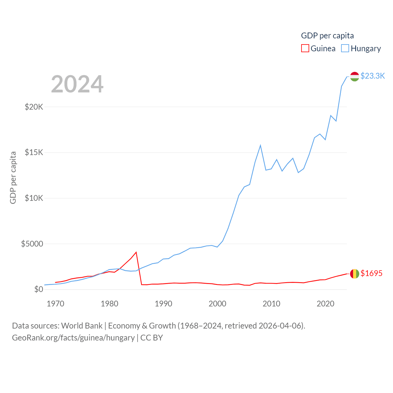 By GDP, Guinea ranks 118/197 ($25B) and Hungary ranks 55/197 ($223B). By GDP per capita, Guinea ranks 160/197 ($1,695), while Hungary ranks 55/197 ($23,292).
