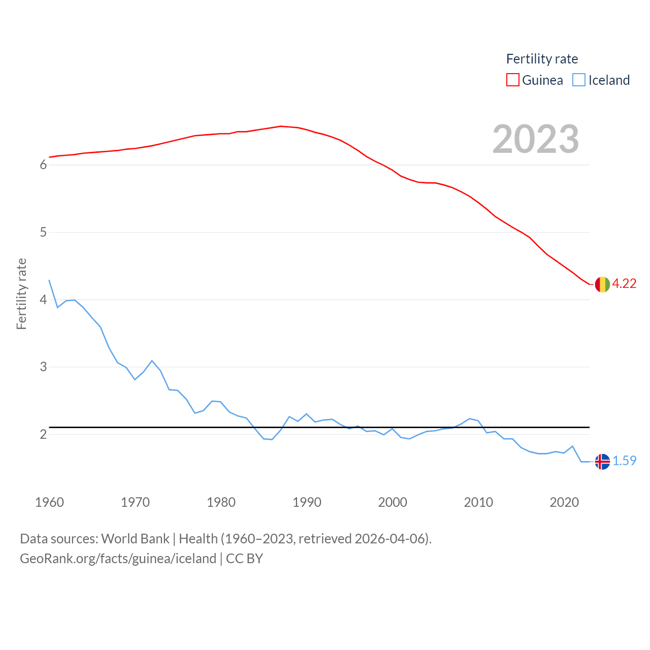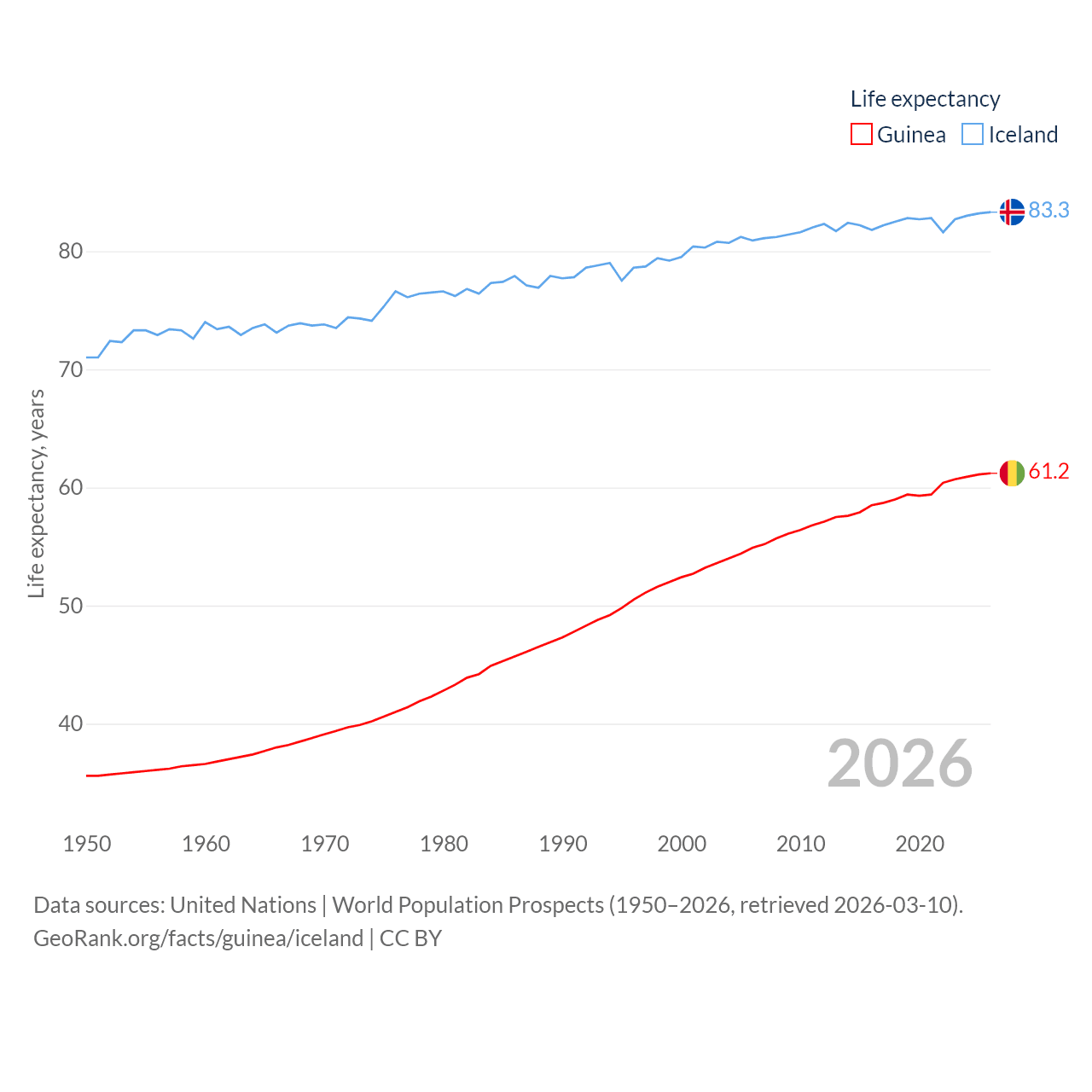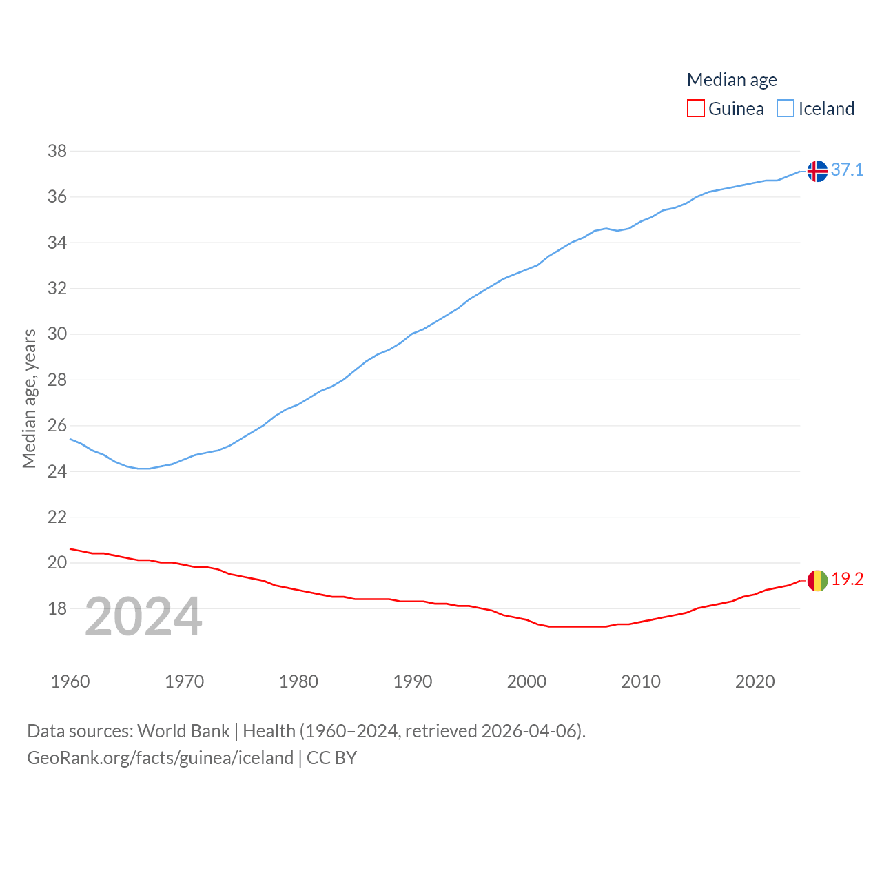 Guinea has a population of 14.8M (ranked 75/197), compared with 387K in Iceland (ranked 173/197). Guinea's land area is 94,873 sq mi versus 38,931 sq mi for Iceland (ranked 77th vs. 104th).