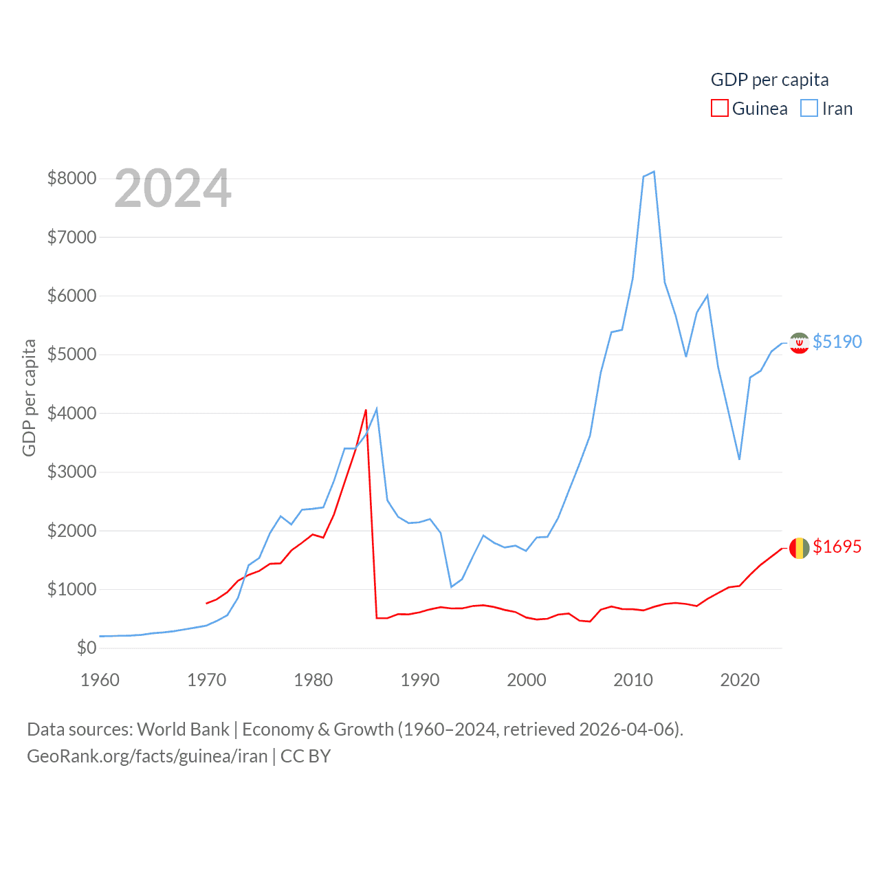 By GDP, Guinea ranks 118/197 ($25B) and Iran ranks 34/197 ($475B). By GDP per capita, Guinea ranks 160/197 ($1,695), while Iran ranks 119/197 ($5,190).