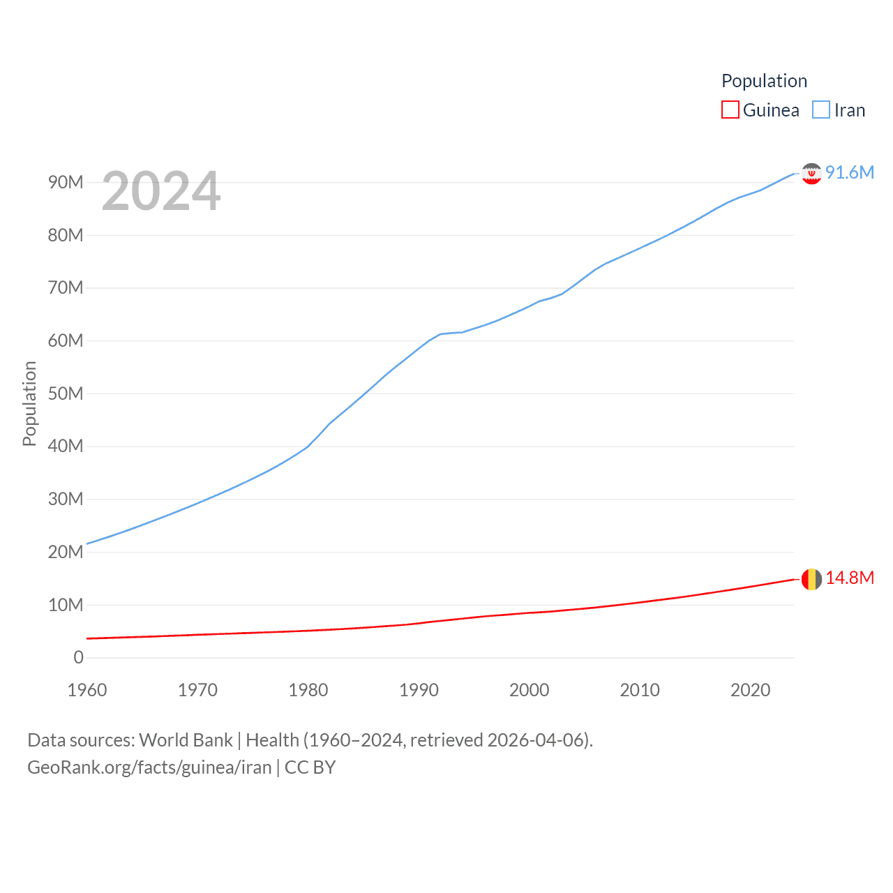 Guinea has a population of 14.8M (ranked 75/197), compared with 91.6M in Iran (ranked 17/197). Guinea's land area is 94,873 sq mi versus 626,451 sq mi for Iran (ranked 77th vs. 17th).