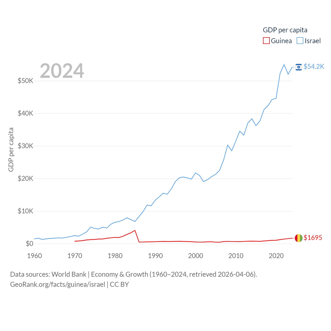 By GDP, Guinea ranks 118/197 ($25B) and Israel ranks 29/197 ($540B). By GDP per capita, Guinea ranks 160/197 ($1,695), while Israel ranks 21/197 ($54,177).