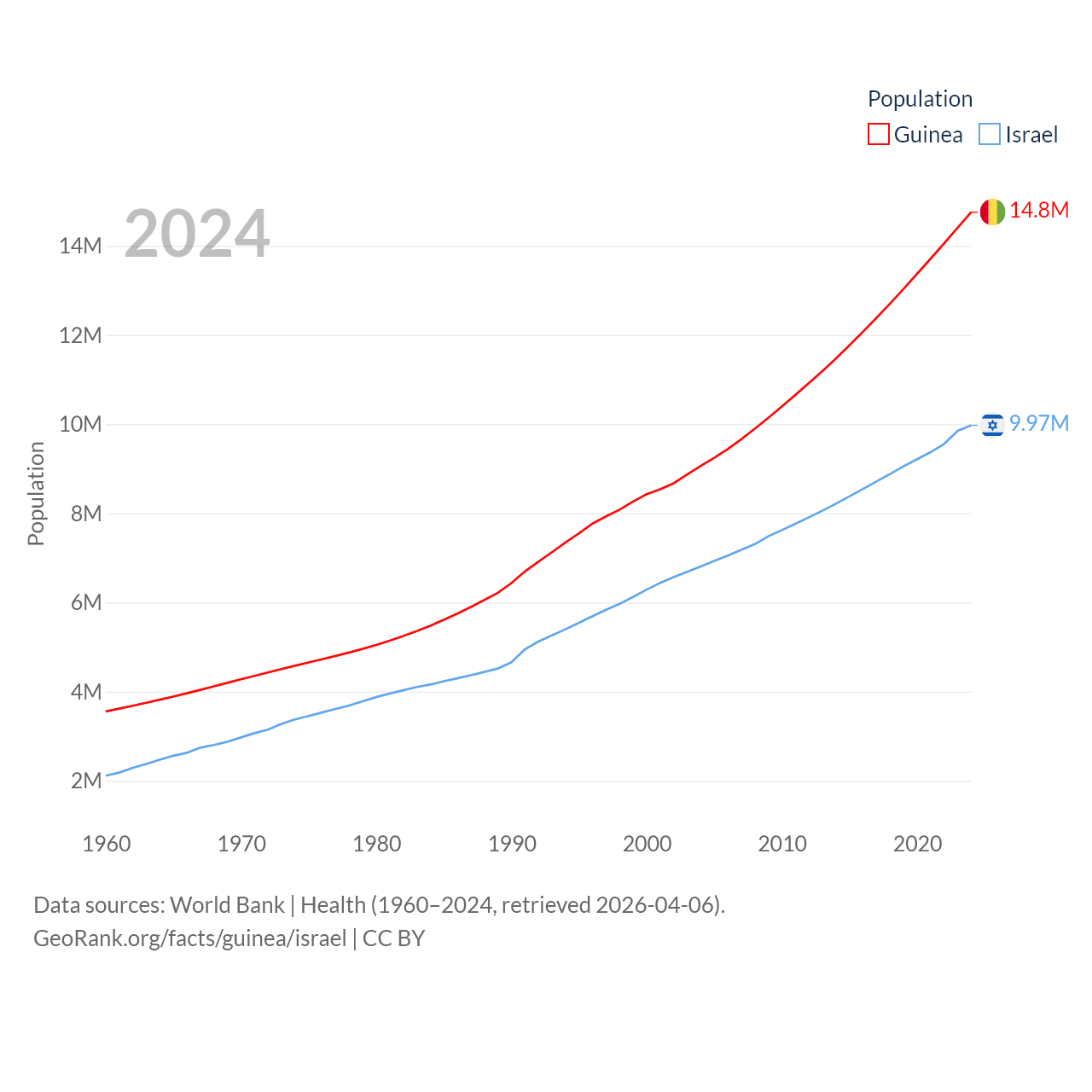 Guinea has a population of 14.8M (ranked 75/197), compared with 9.97M in Israel (ranked 96/197). Guinea's land area is 94,873 sq mi versus 8,355 sq mi for Israel (ranked 77th vs. 149th).