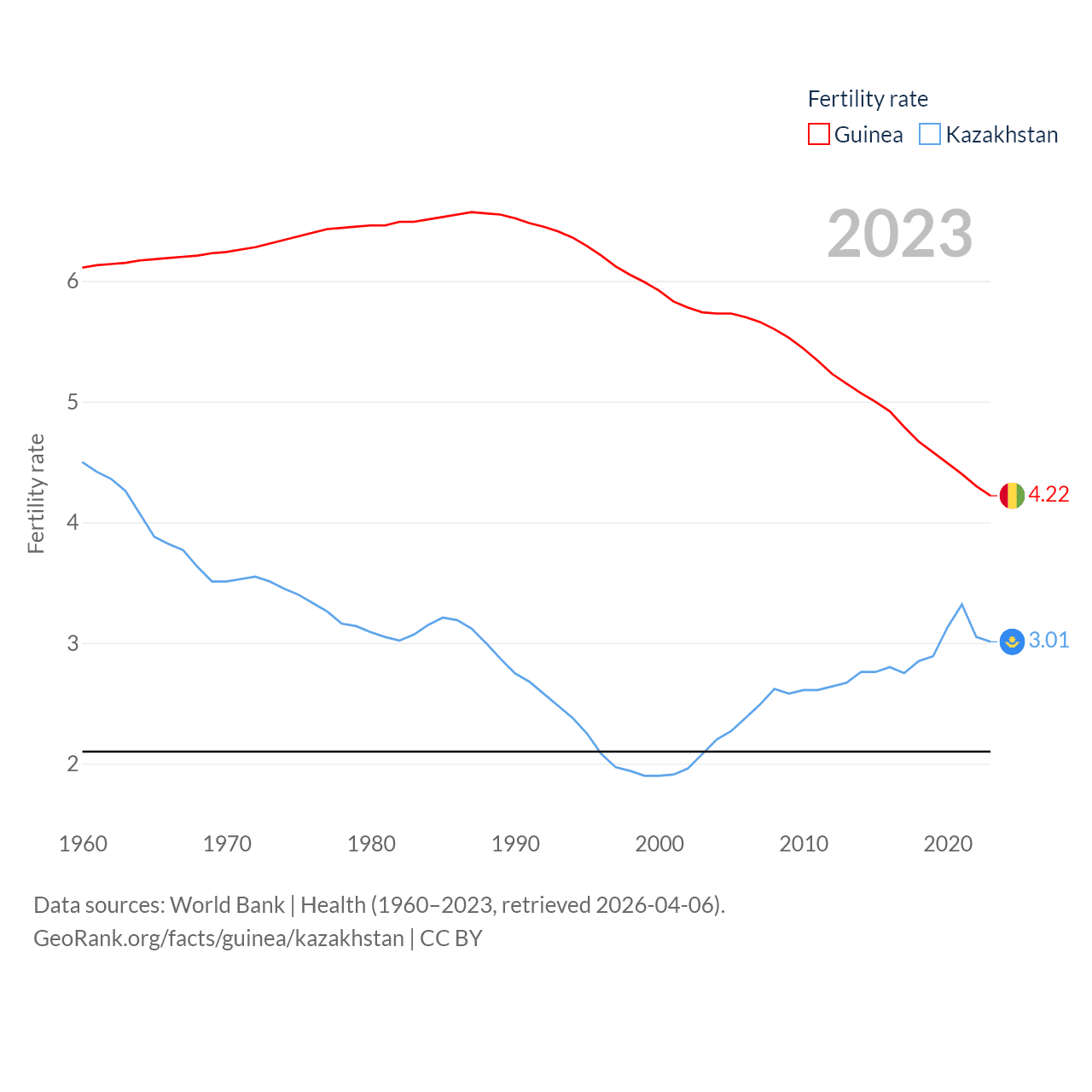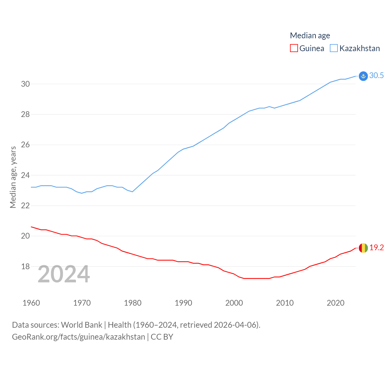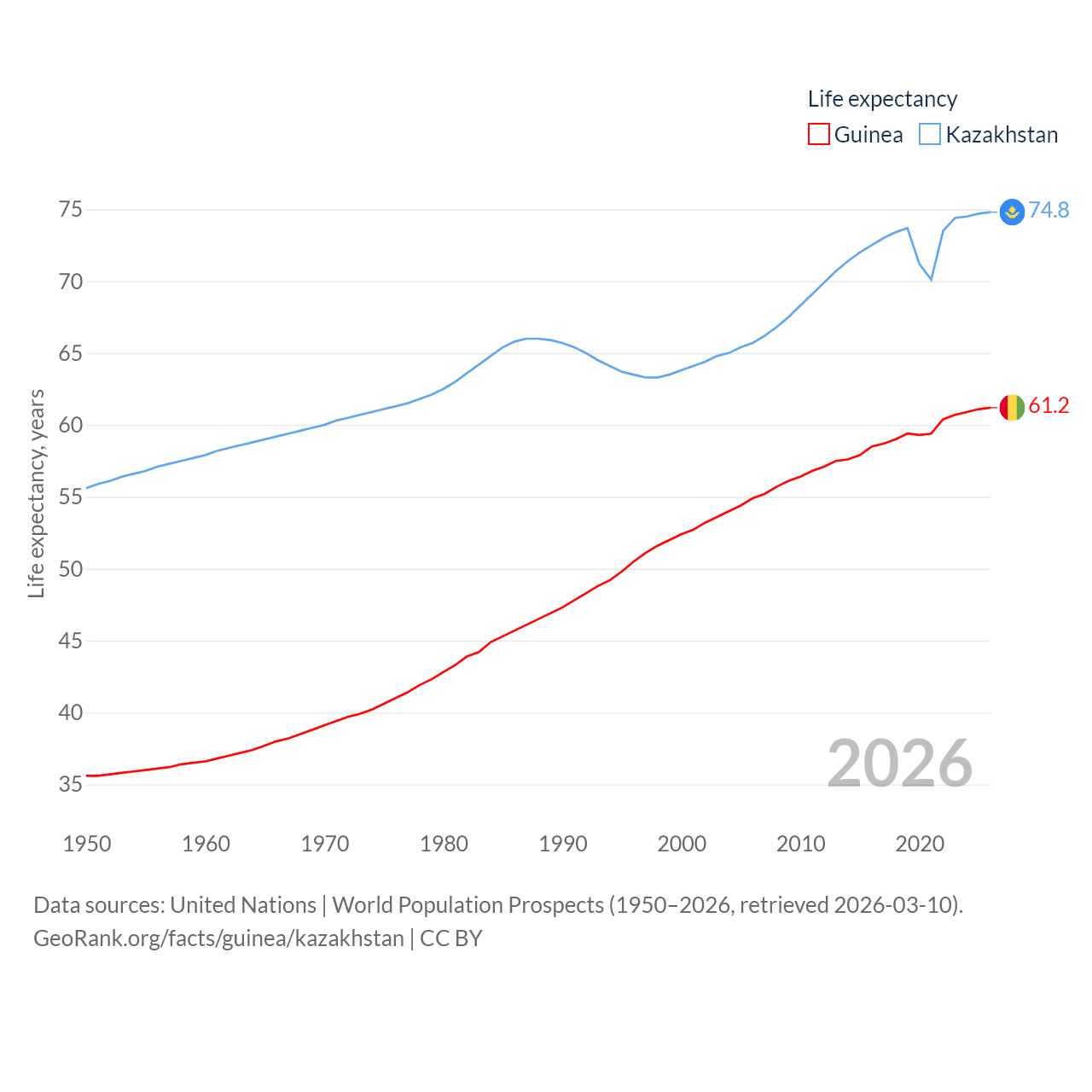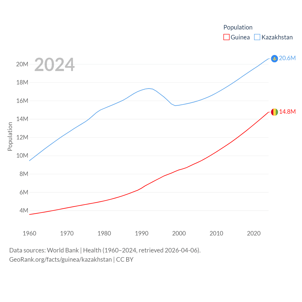 Guinea has a population of 14.8M (ranked 75/197), compared with 20.6M in Kazakhstan (ranked 64/197). Guinea's land area is 94,873 sq mi versus 1,042,360 sq mi for Kazakhstan (ranked 77th vs. 9th).