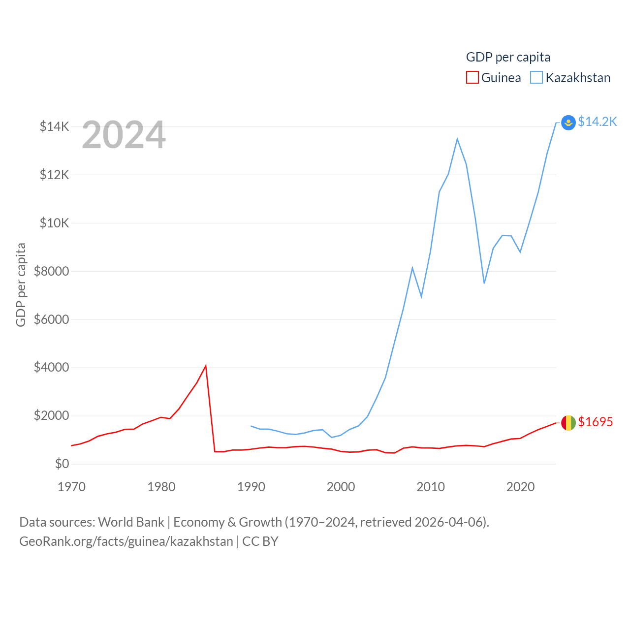 By GDP, Guinea ranks 118/197 ($25B) and Kazakhstan ranks 48/197 ($291B). By GDP per capita, Guinea ranks 160/197 ($1,695), while Kazakhstan ranks 71/197 ($14,155).