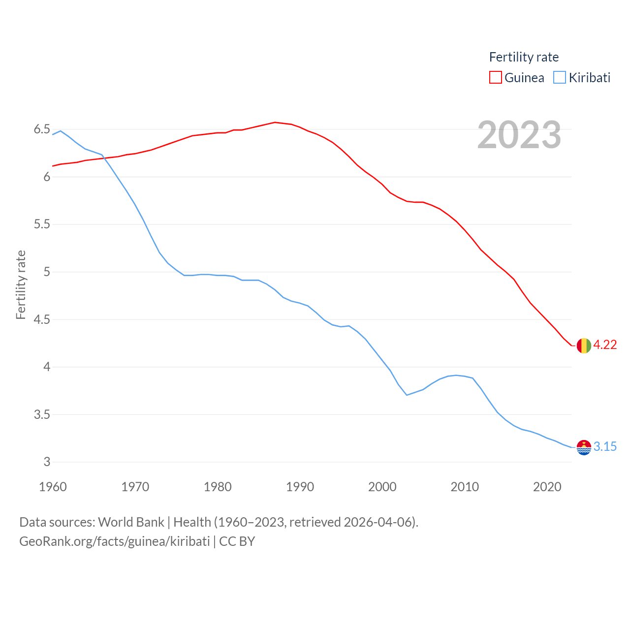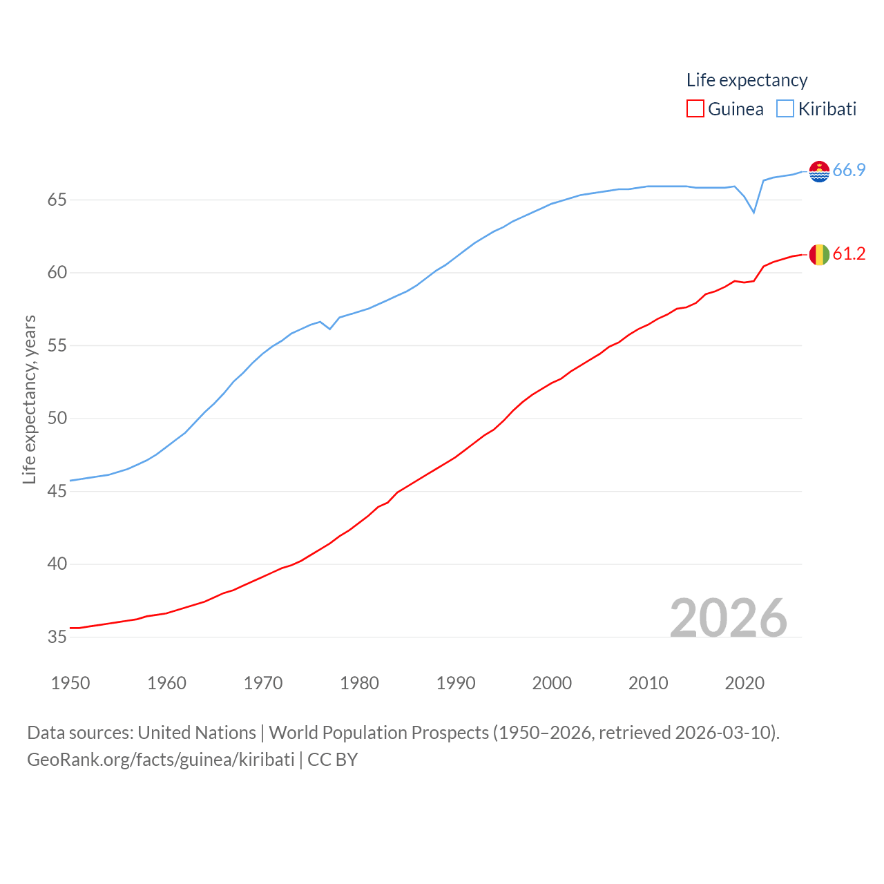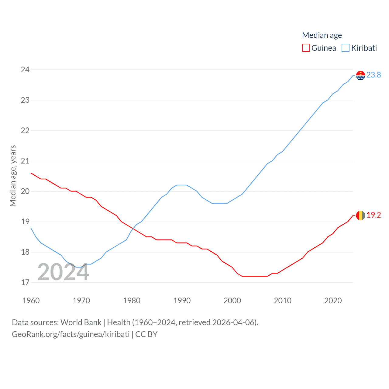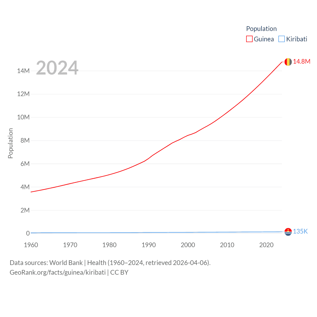 Guinea has a population of 14.8M (ranked 75/197), compared with 135K in Kiribati (ranked 180/197). Guinea's land area is 94,873 sq mi versus 313 sq mi for Kiribati (ranked 77th vs. 173rd).
