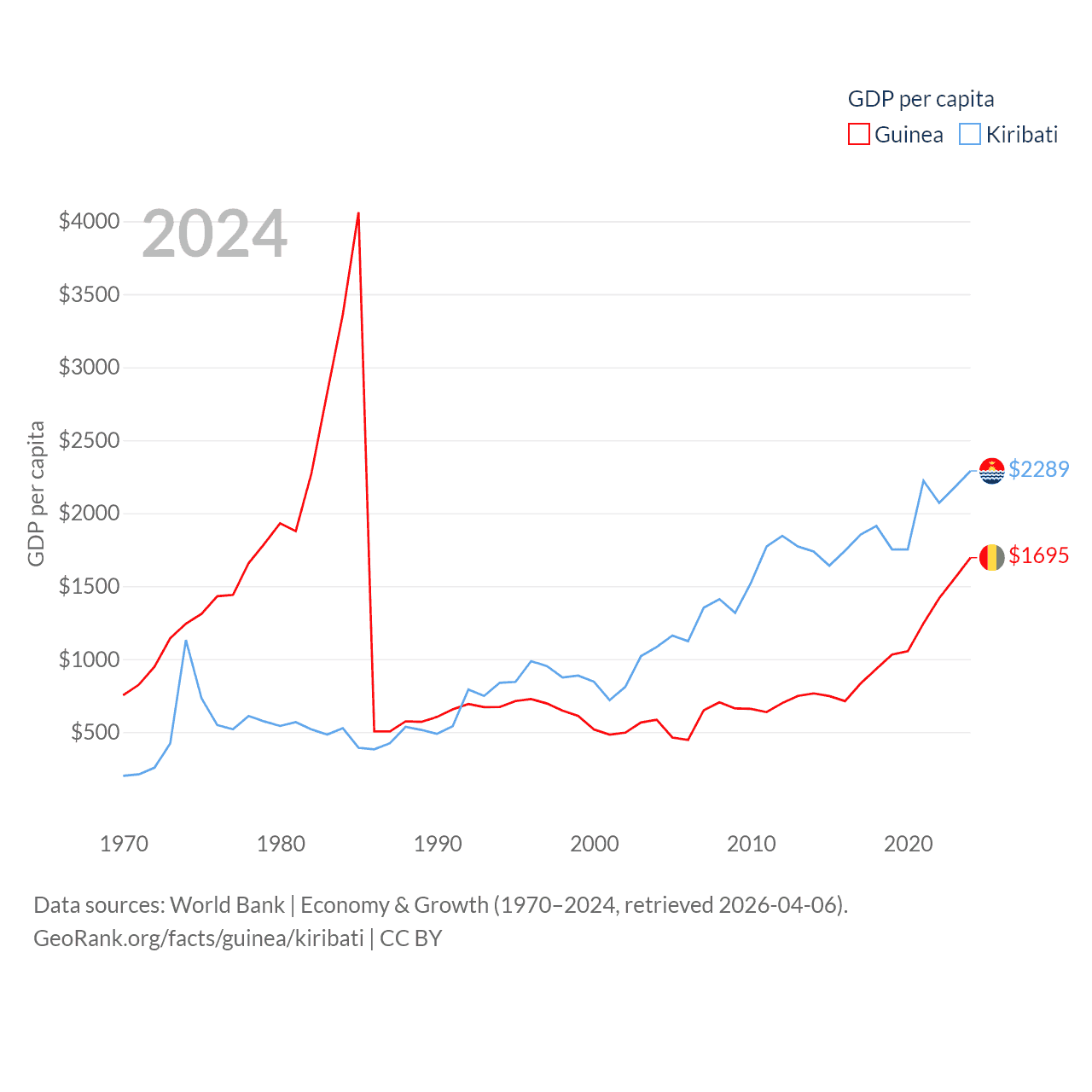 By GDP, Guinea ranks 118/197 ($25B) and Kiribati ranks 192/197 ($308M). By GDP per capita, Guinea ranks 160/197 ($1,695), while Kiribati ranks 152/197 ($2,289).