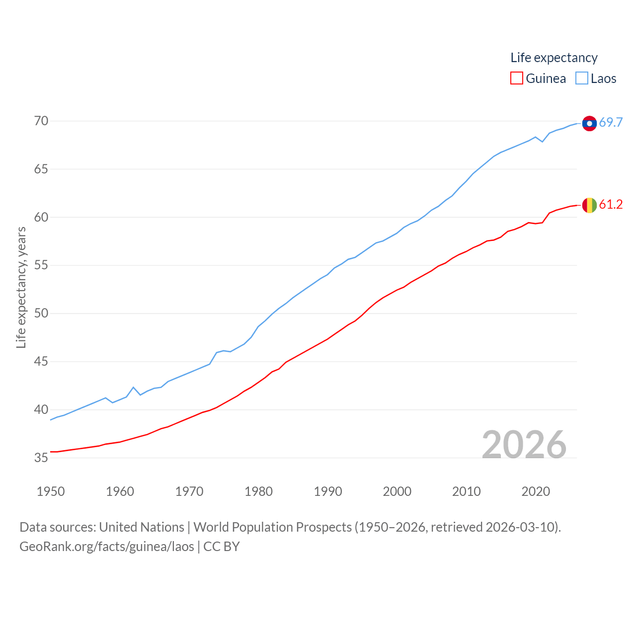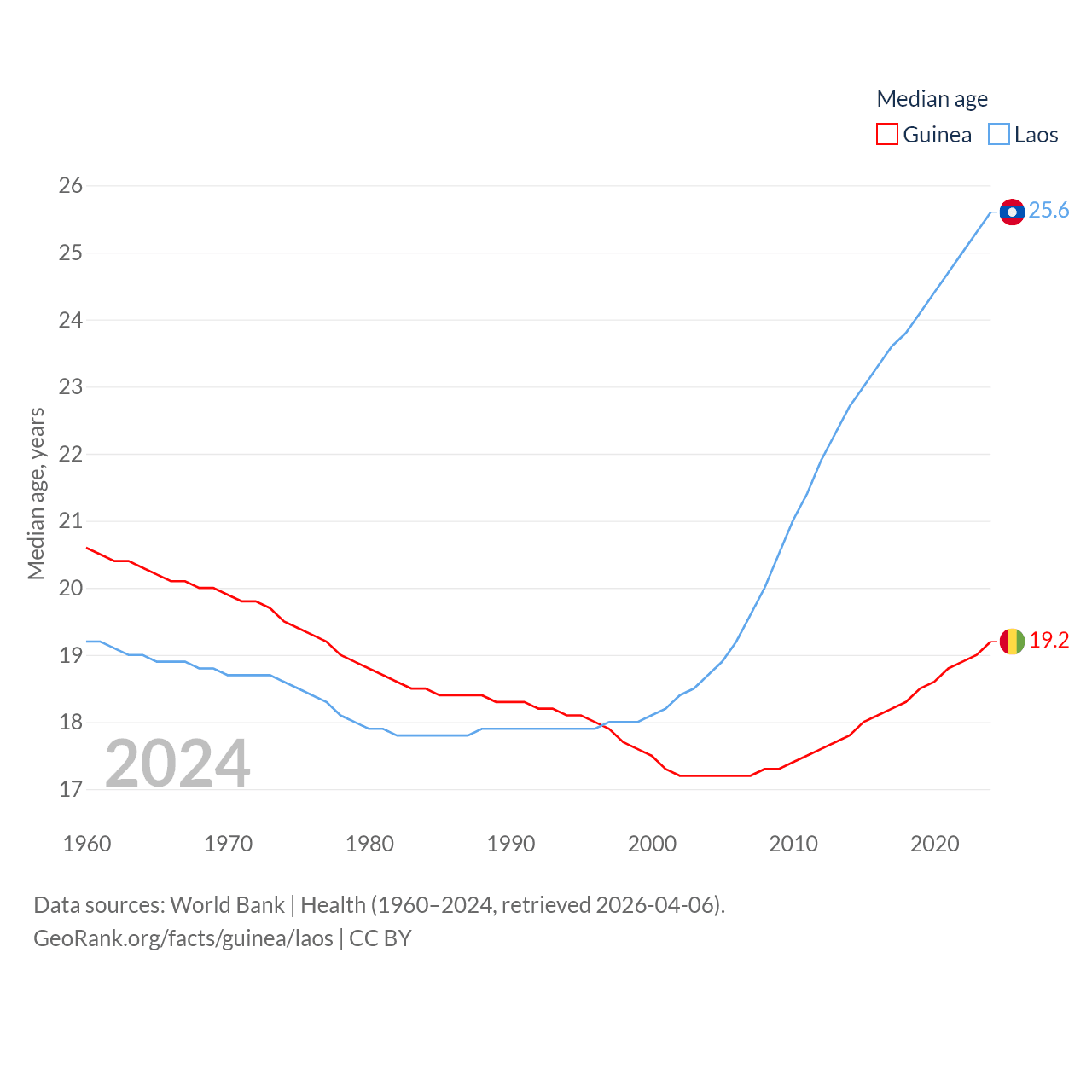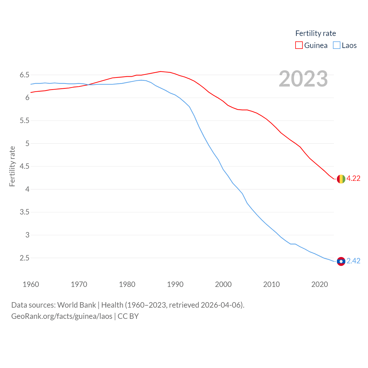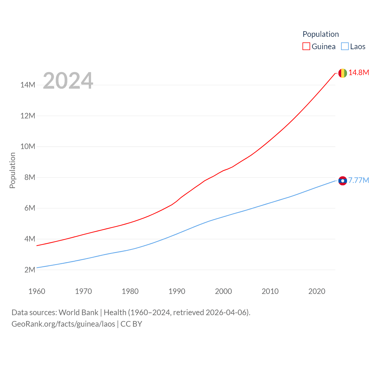 Guinea has a population of 14.8M (ranked 75/197), compared with 7.77M in Laos (ranked 103/197). Guinea's land area is 94,873 sq mi versus 89,112 sq mi for Laos (ranked 77th vs. 79th).