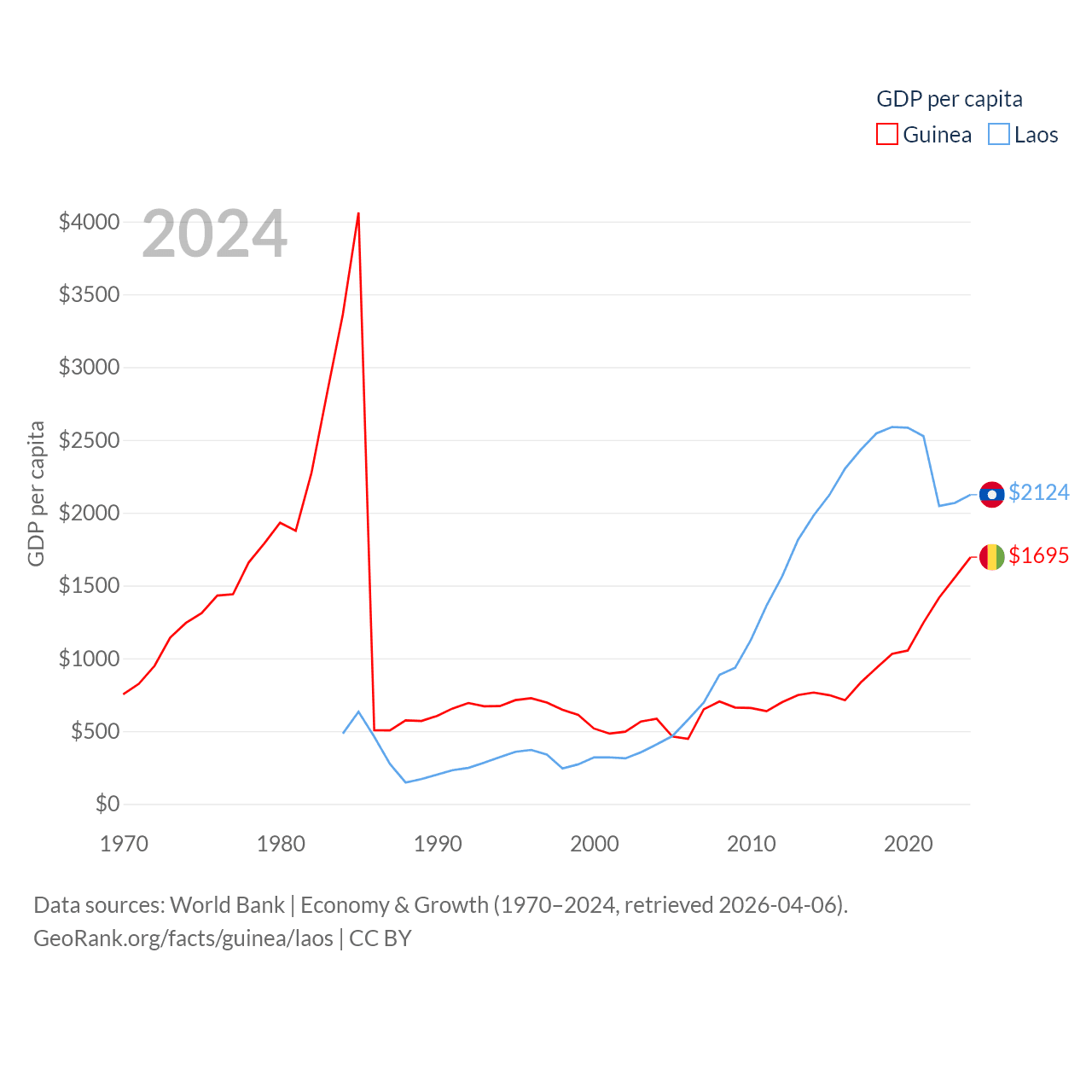 By GDP, Guinea ranks 118/197 ($25B) and Laos ranks 139/197 ($16.5B). By GDP per capita, Guinea ranks 160/197 ($1,695), while Laos ranks 155/197 ($2,124).
