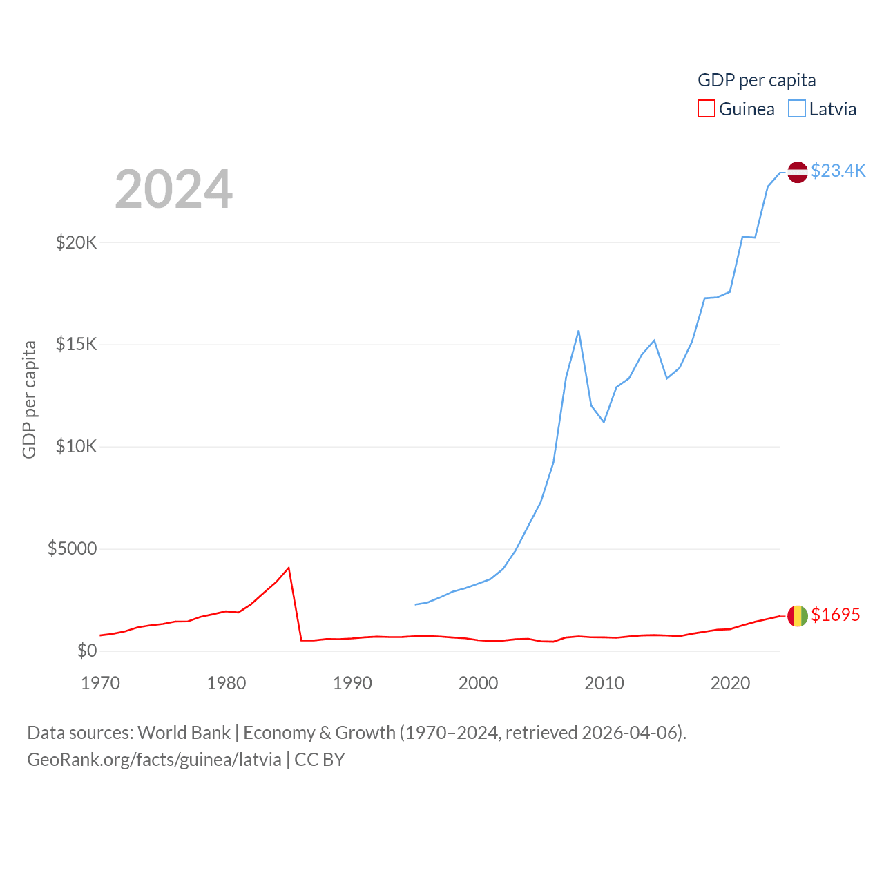 By GDP, Guinea ranks 118/197 ($25B) and Latvia ranks 99/197 ($43.7B). By GDP per capita, Guinea ranks 160/197 ($1,695), while Latvia ranks 54/197 ($23,409).