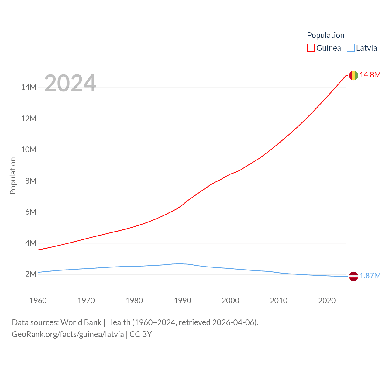 Guinea has a population of 14.8M (ranked 75/197), compared with 1.87M in Latvia (ranked 149/197). Guinea's land area is 94,873 sq mi versus 24,027 sq mi for Latvia (ranked 77th vs. 121st).