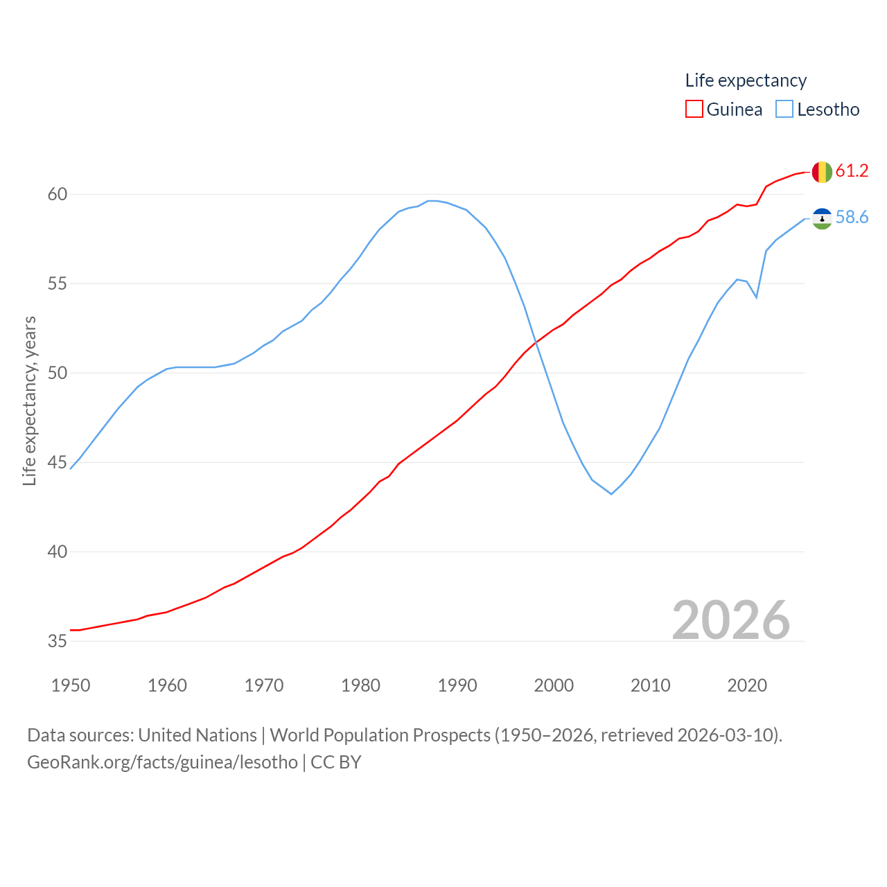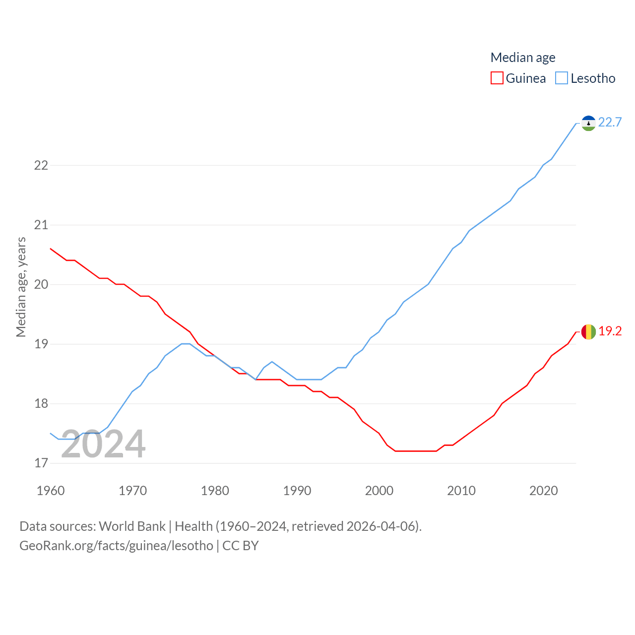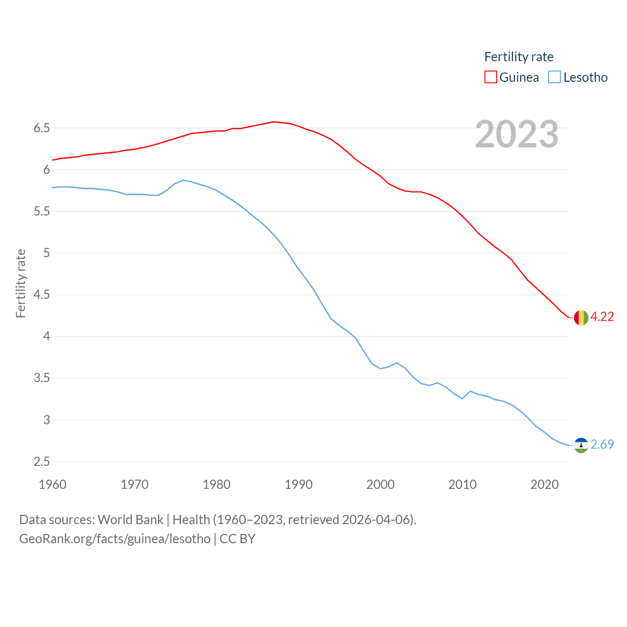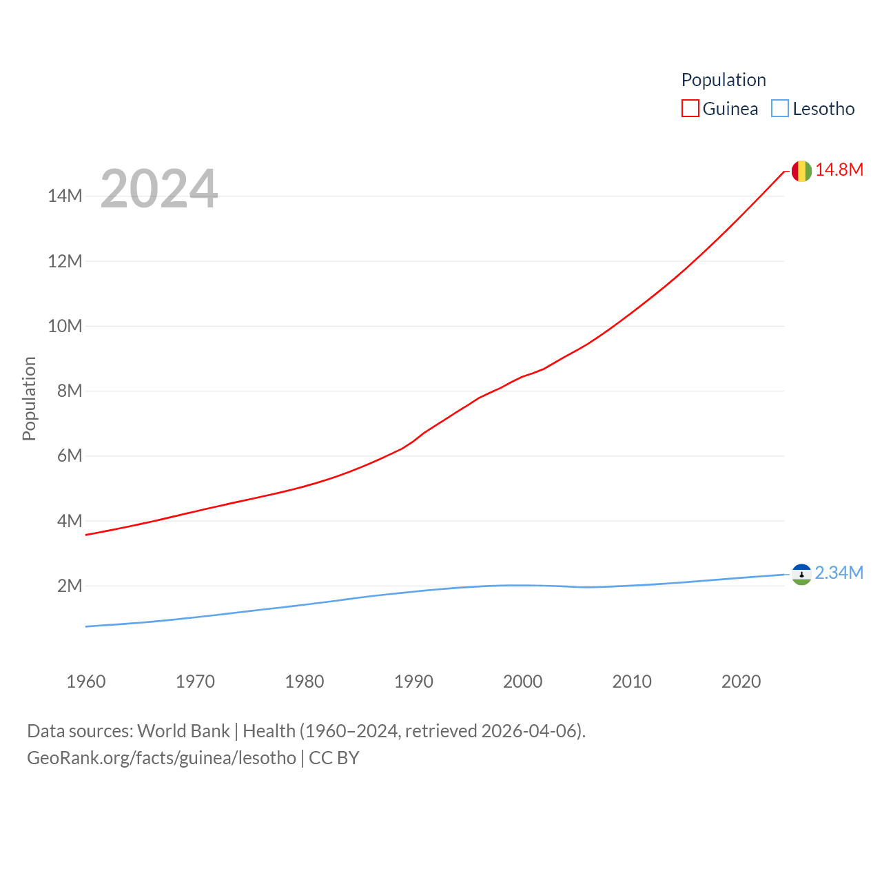 Guinea has a population of 14.8M (ranked 75/197), compared with 2.34M in Lesotho (ranked 145/197). Guinea's land area is 94,873 sq mi versus 11,722 sq mi for Lesotho (ranked 77th vs. 137th).