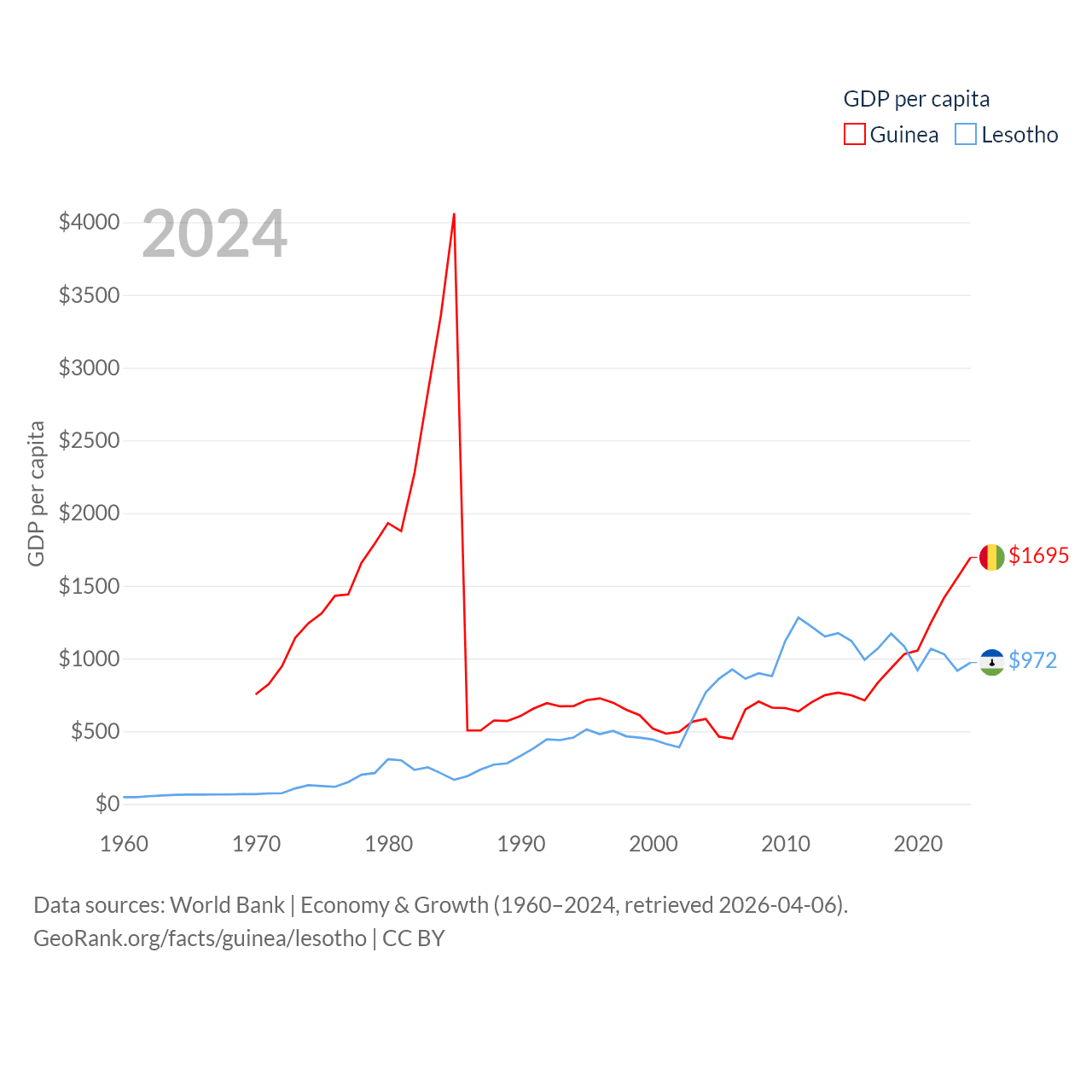 By GDP, Guinea ranks 118/197 ($25B) and Lesotho ranks 175/197 ($2.27B). By GDP per capita, Guinea ranks 160/197 ($1,695), while Lesotho ranks 181/197 ($972).