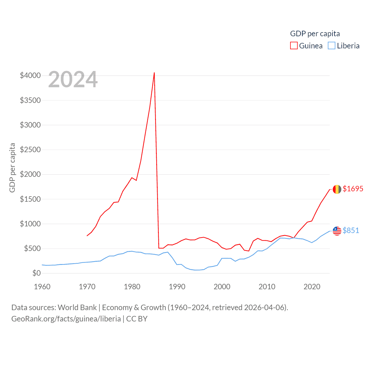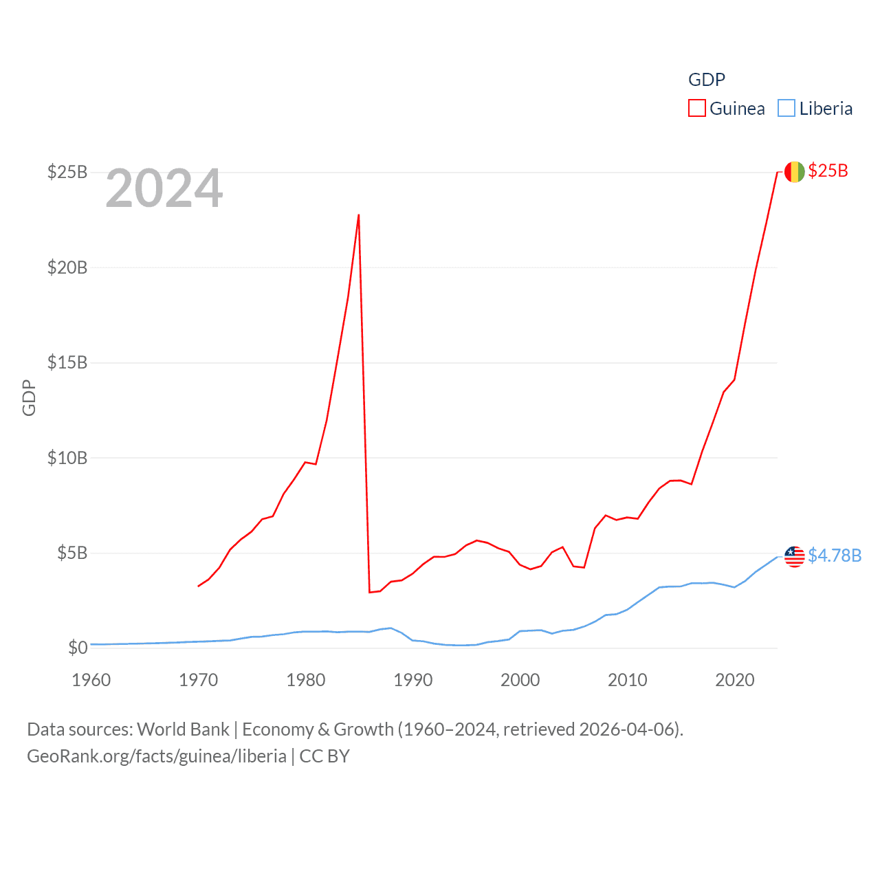 By GDP, Guinea ranks 118/197 ($25B) and Liberia ranks 163/197 ($4.78B). By GDP per capita, Guinea ranks 160/197 ($1,695), while Liberia ranks 184/197 ($851).