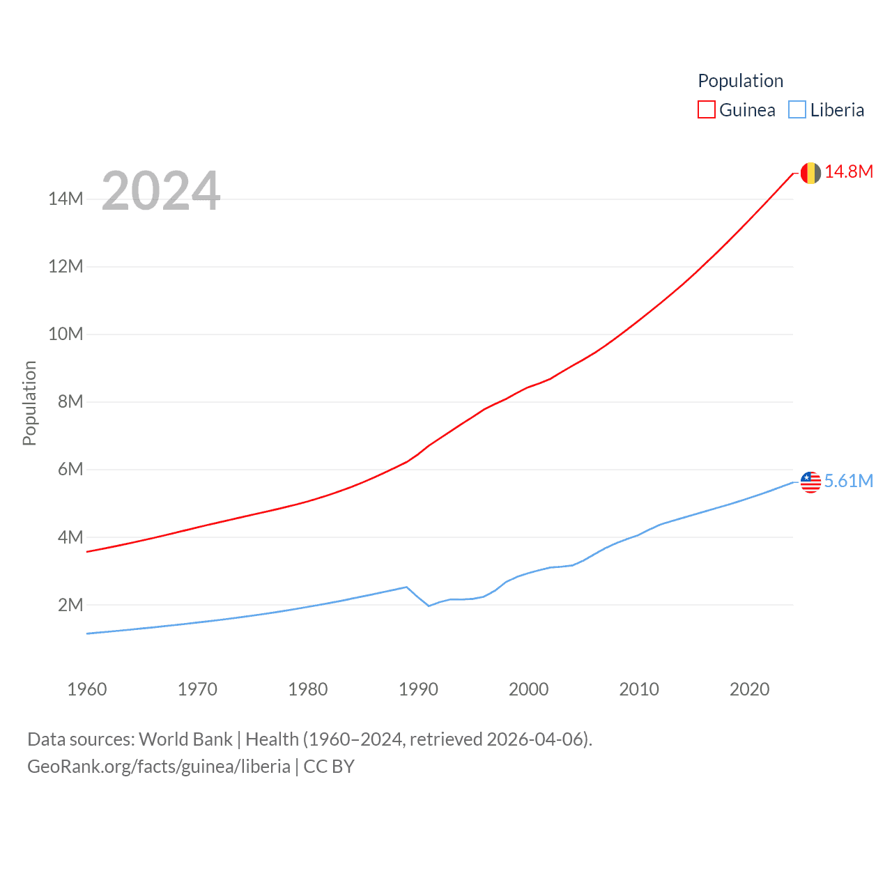 Guinea has a population of 14.8M (ranked 75/197), compared with 5.61M in Liberia (ranked 117/197). Guinea's land area is 94,873 sq mi versus 37,189 sq mi for Liberia (ranked 77th vs. 106th).
