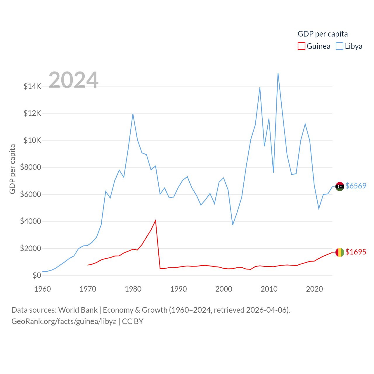By GDP, Guinea ranks 118/197 ($25B) and Libya ranks 95/197 ($48.5B). By GDP per capita, Guinea ranks 160/197 ($1,695), while Libya ranks 107/197 ($6,569).