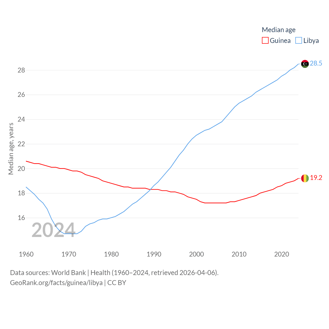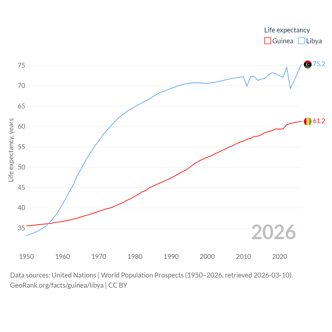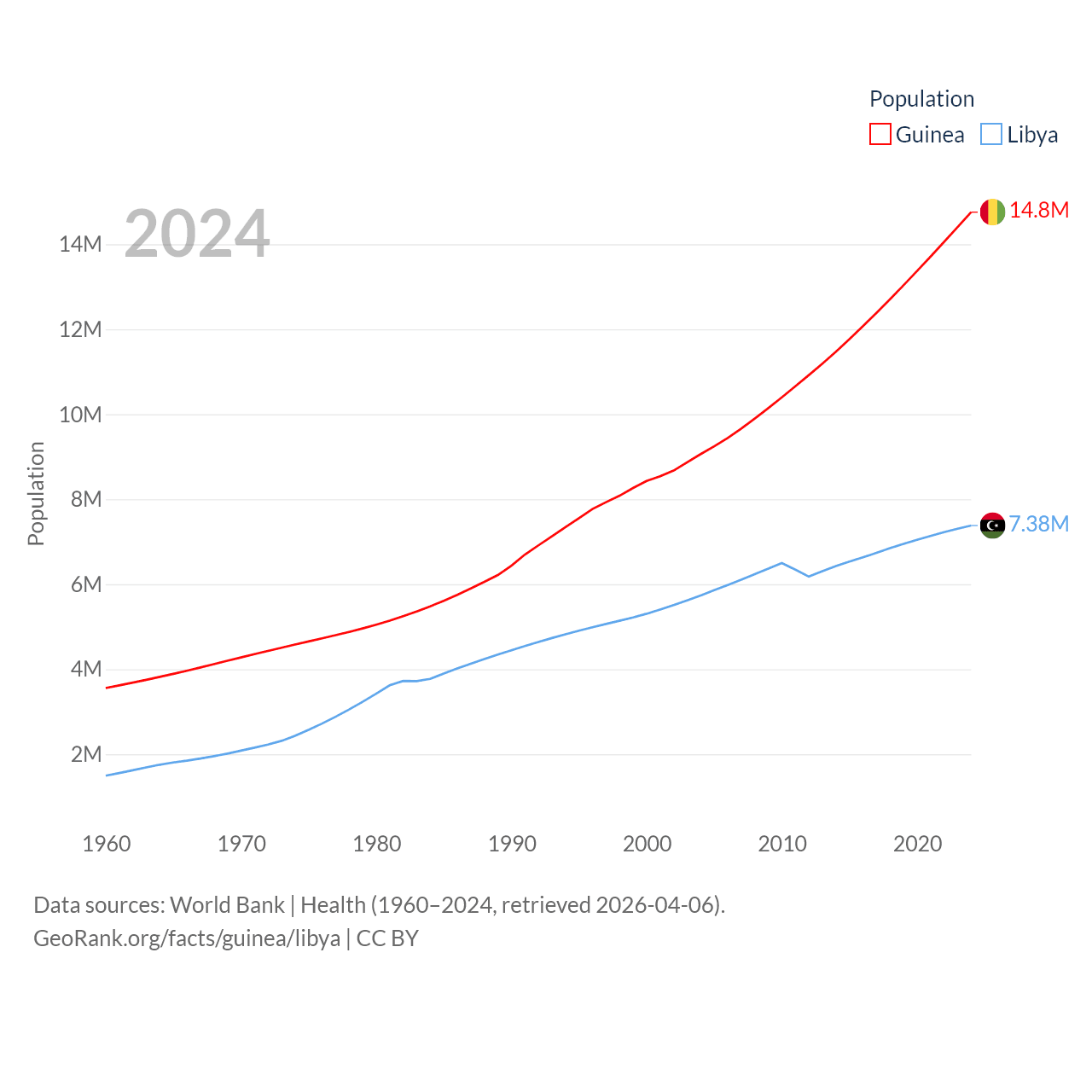 Guinea has a population of 14.8M (ranked 75/197), compared with 7.38M in Libya (ranked 105/197). Guinea's land area is 94,873 sq mi versus 679,362 sq mi for Libya (ranked 77th vs. 16th).