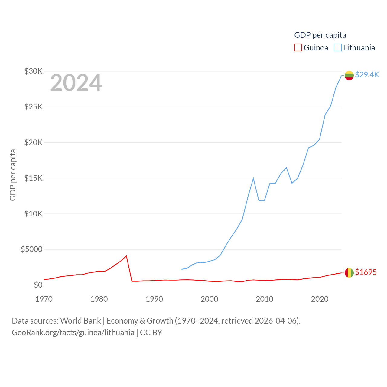 By GDP, Guinea ranks 118/197 ($25B) and Lithuania ranks 79/197 ($84.9B). By GDP per capita, Guinea ranks 160/197 ($1,695), while Lithuania ranks 43/197 ($29,384).