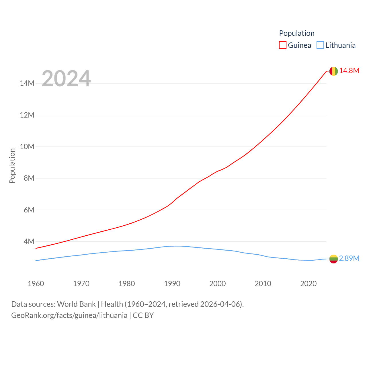 Guinea has a population of 14.8M (ranked 75/197), compared with 2.89M in Lithuania (ranked 137/197). Guinea's land area is 94,873 sq mi versus 24,170 sq mi for Lithuania (ranked 77th vs. 120th).