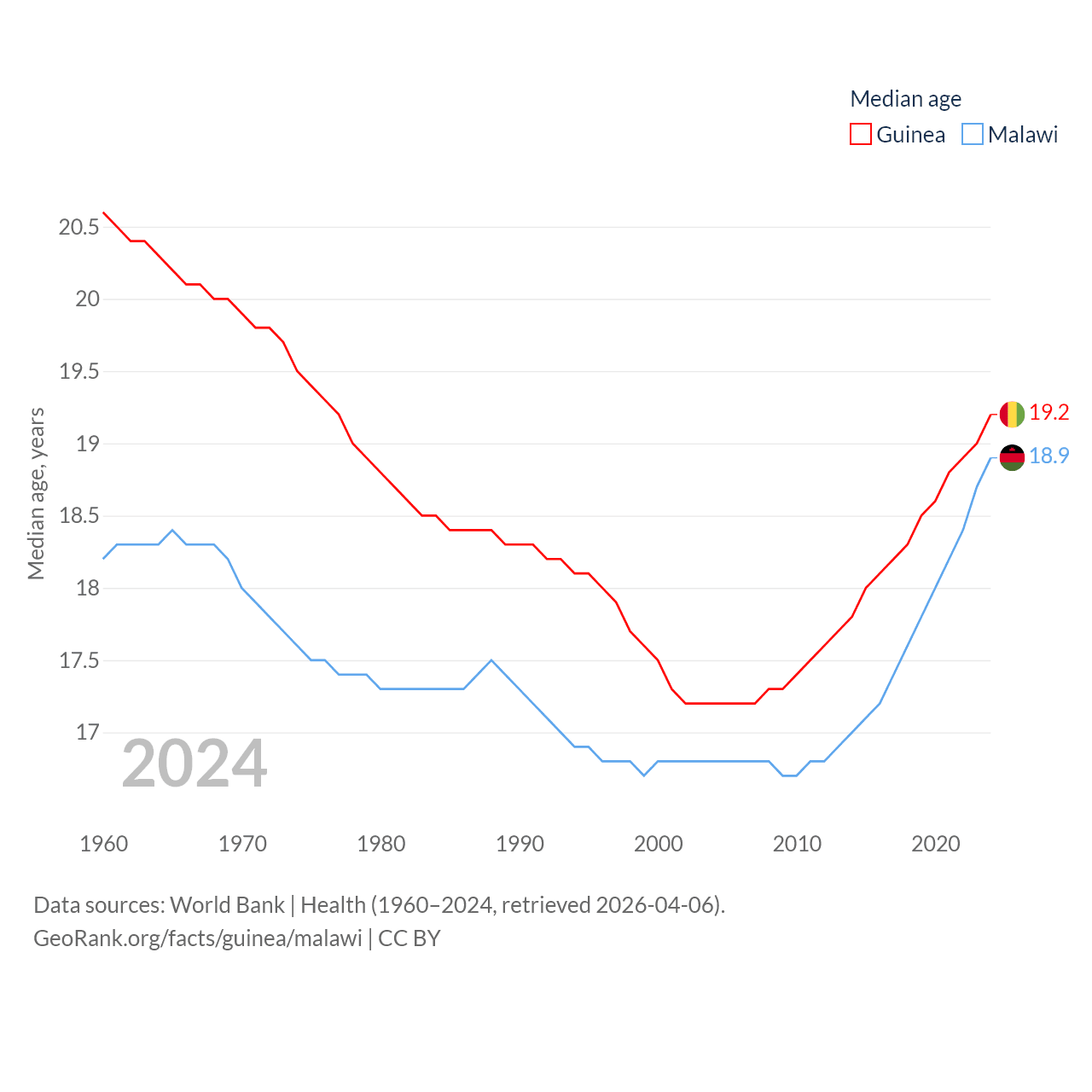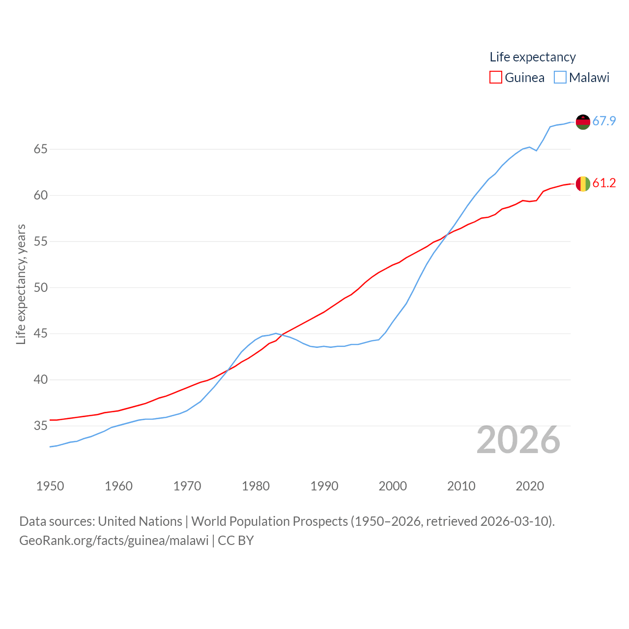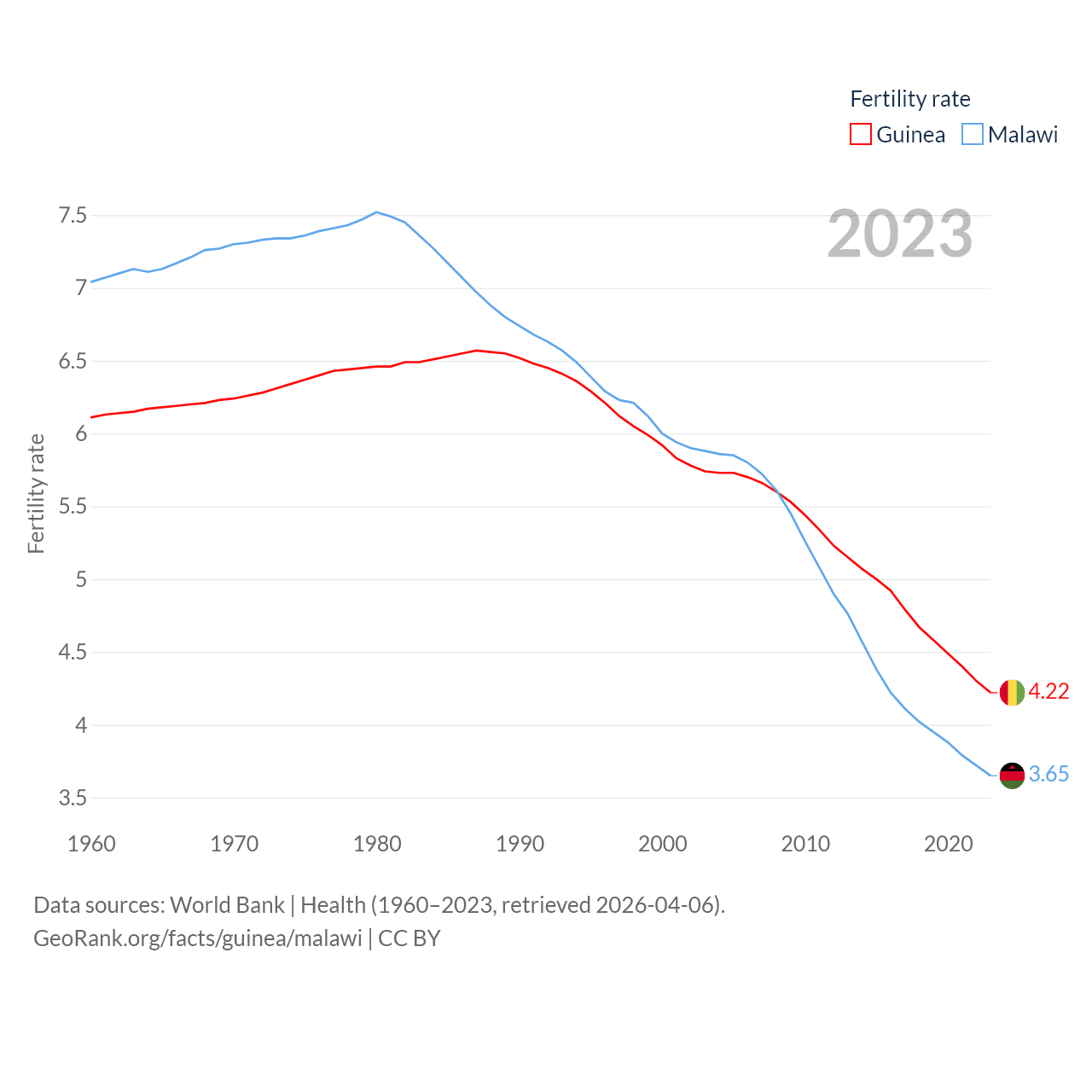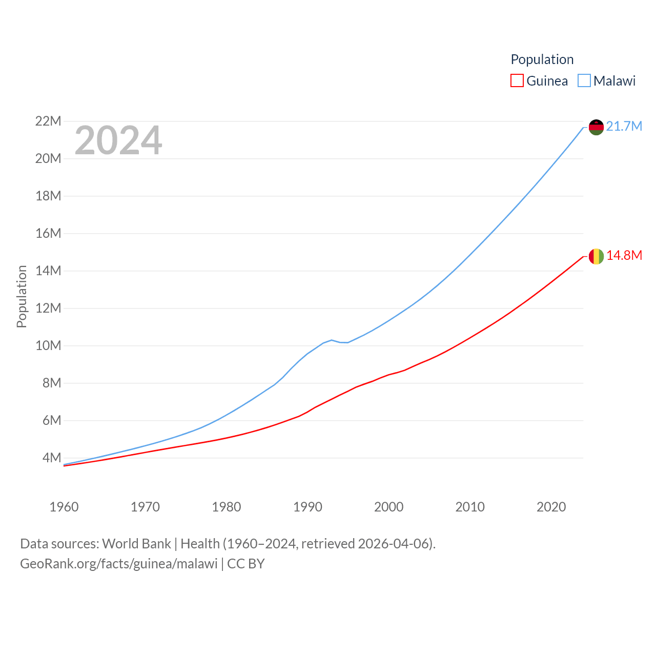 Guinea has a population of 14.8M (ranked 75/197), compared with 21.7M in Malawi (ranked 62/197). Guinea's land area is 94,873 sq mi versus 36,402 sq mi for Malawi (ranked 77th vs. 107th).