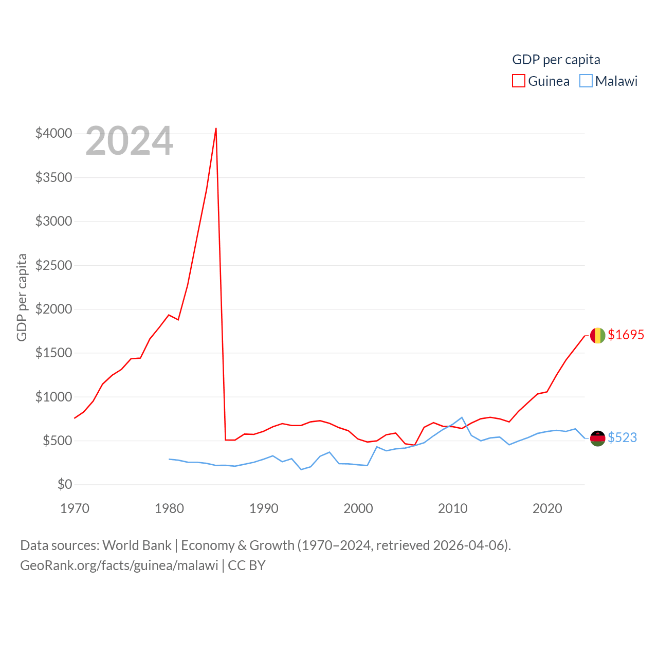 By GDP, Guinea ranks 118/197 ($25B) and Malawi ranks 151/197 ($11.3B). By GDP per capita, Guinea ranks 160/197 ($1,695), while Malawi ranks 194/197 ($523).