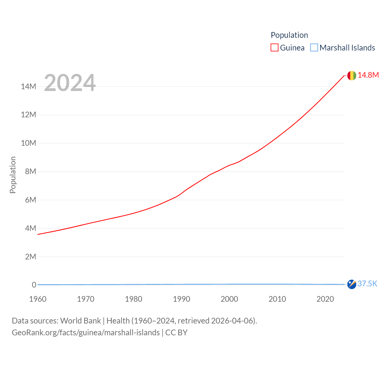 Guinea has a population of 14.8M (ranked 75/197), compared with 37.5K in The Marshall Islands (ranked 192/197). Guinea's land area is 94,873 sq mi versus 69.5 sq mi for The Marshall Islands (ranked 77th vs. 191st).